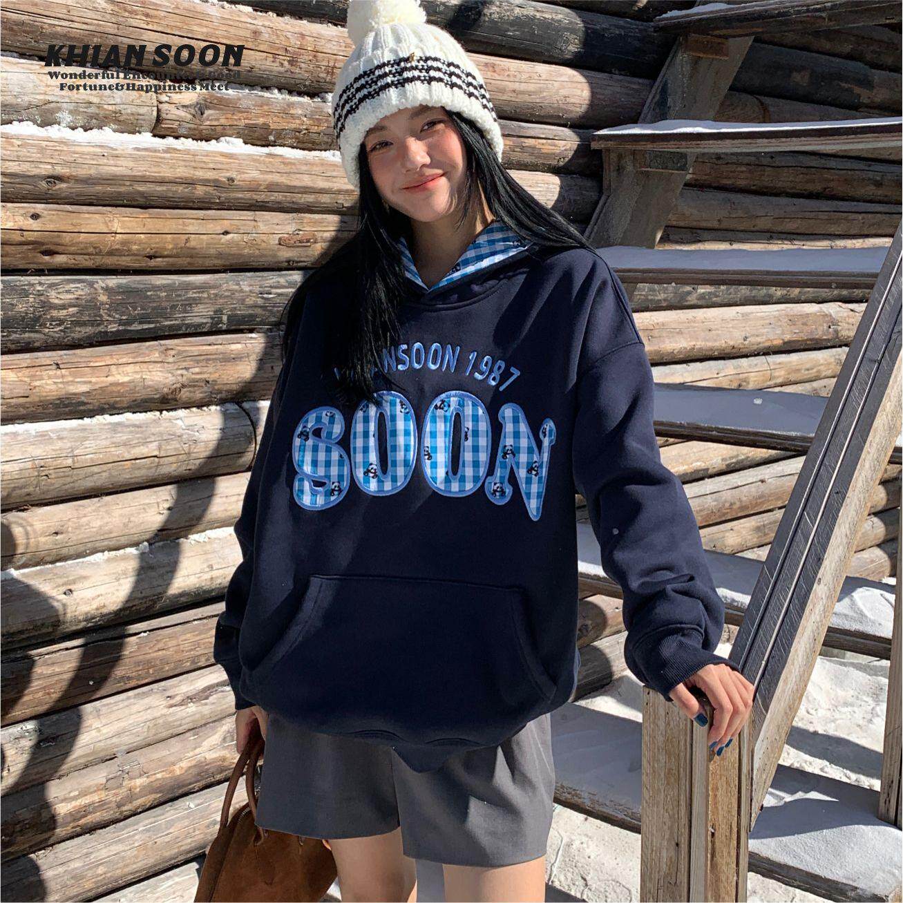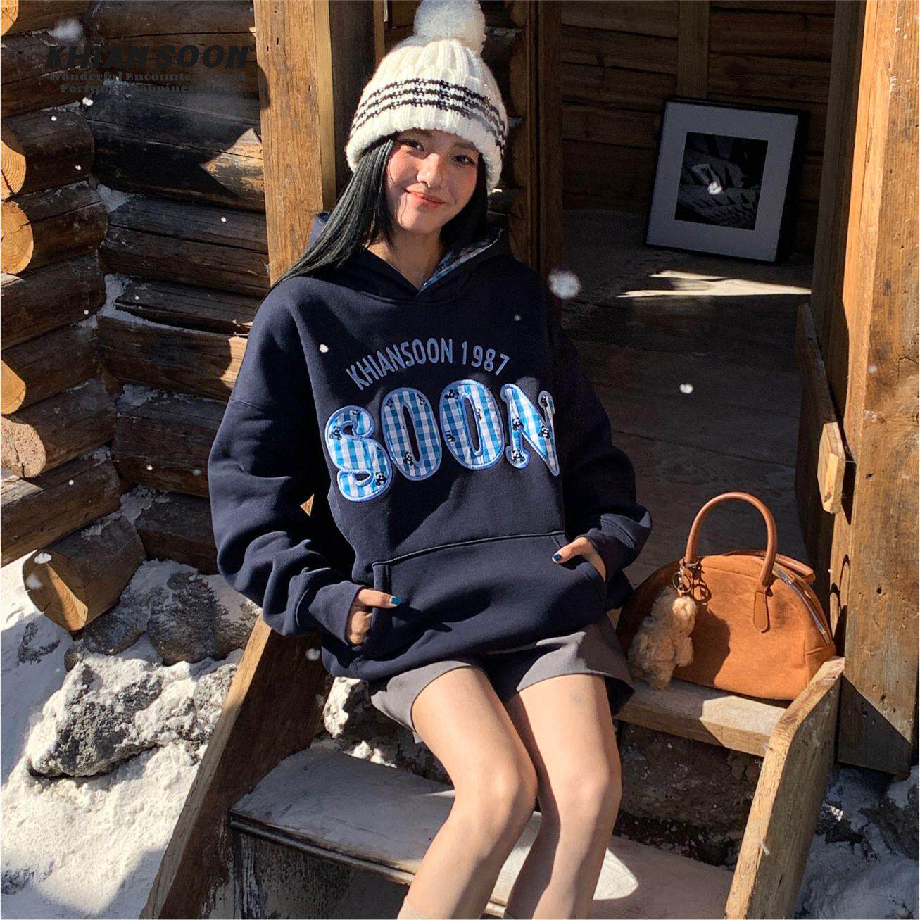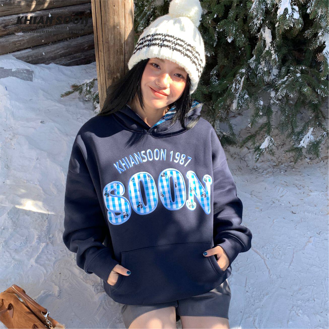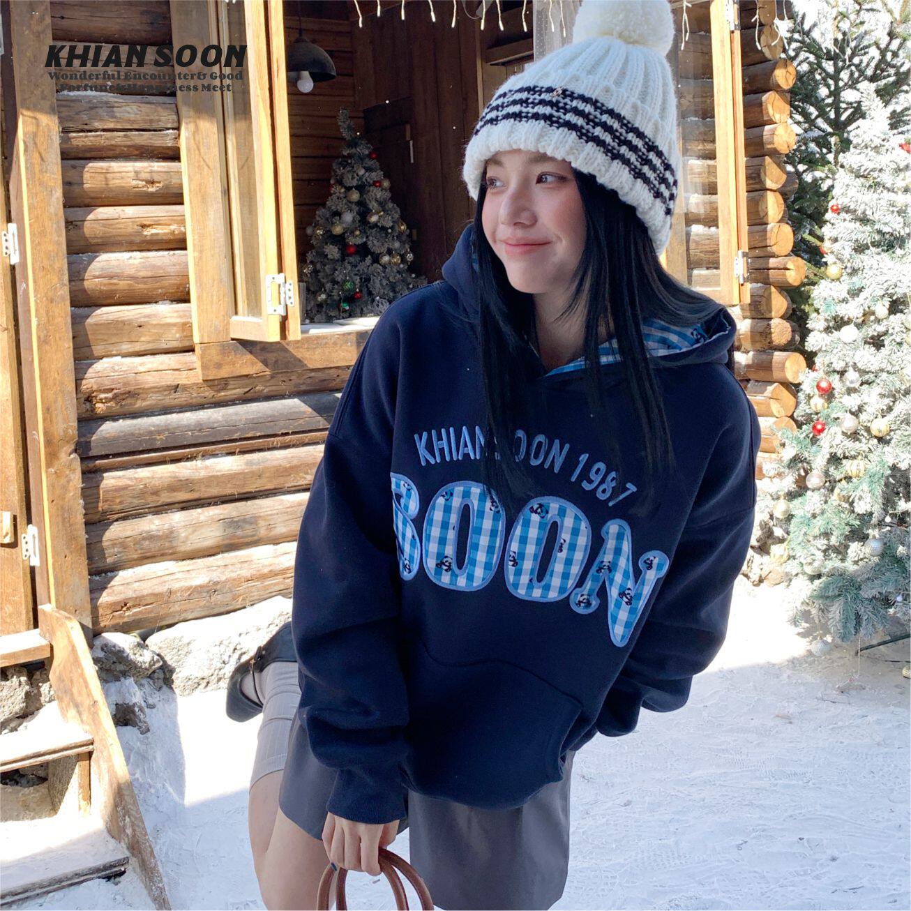 KHIAN SOON熊猫贴布绣花字母国潮卫衣女宽松加绒帽衫圣诞过年2025