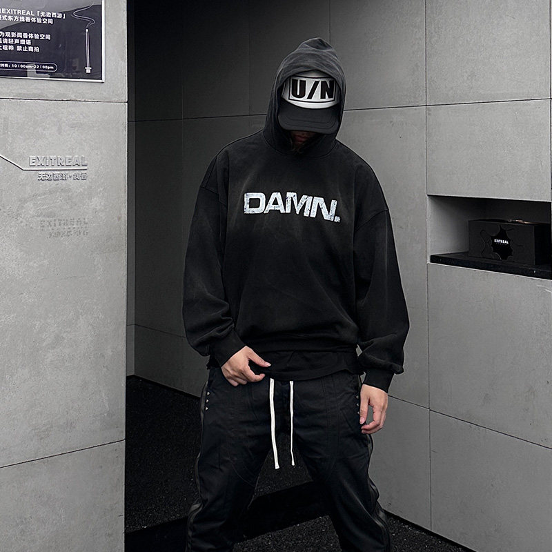 Commas 原创国潮水洗做旧DAMN帽衫宽松休闲美式高街潮流连帽卫衣