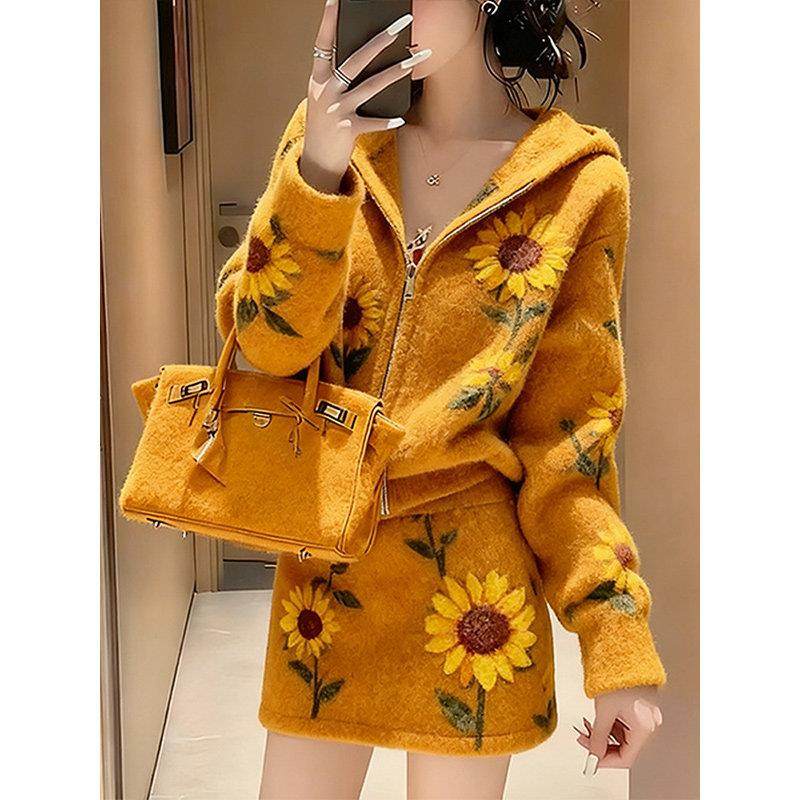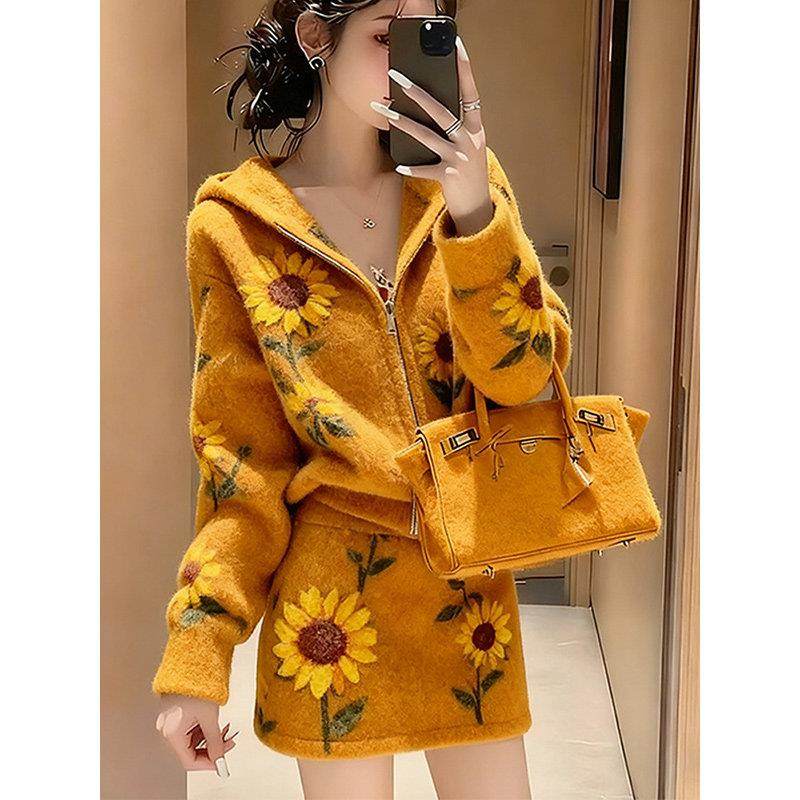 2026年新款多巴胺风向日葵针织套装秋冬黄色连帽上衣半身裙两件套