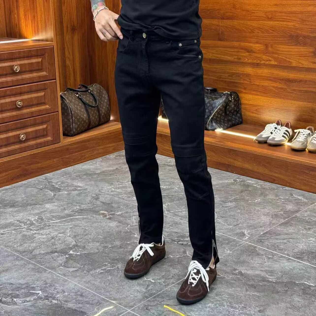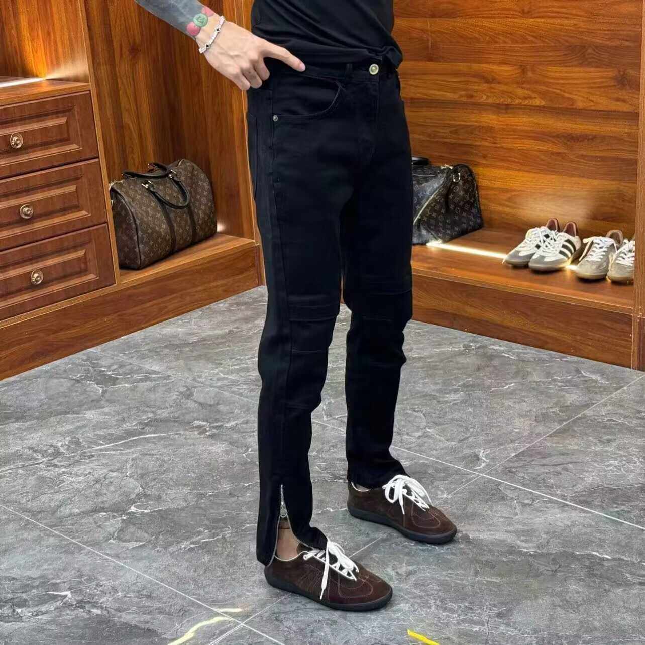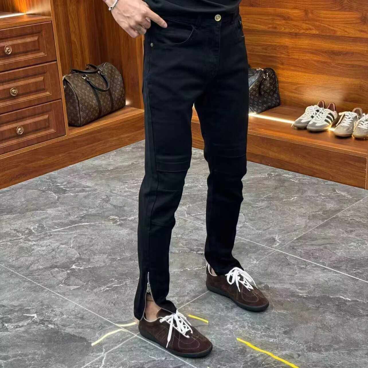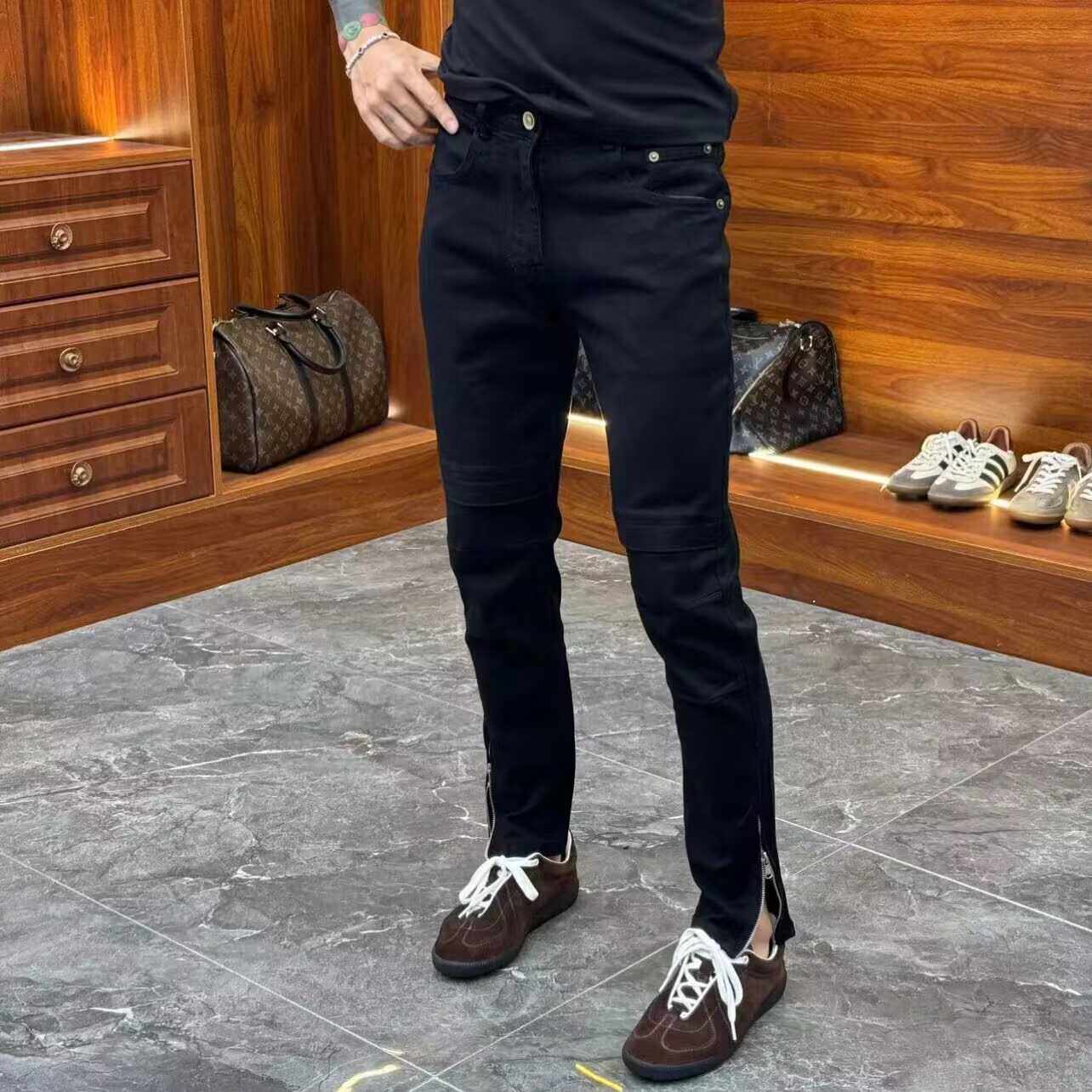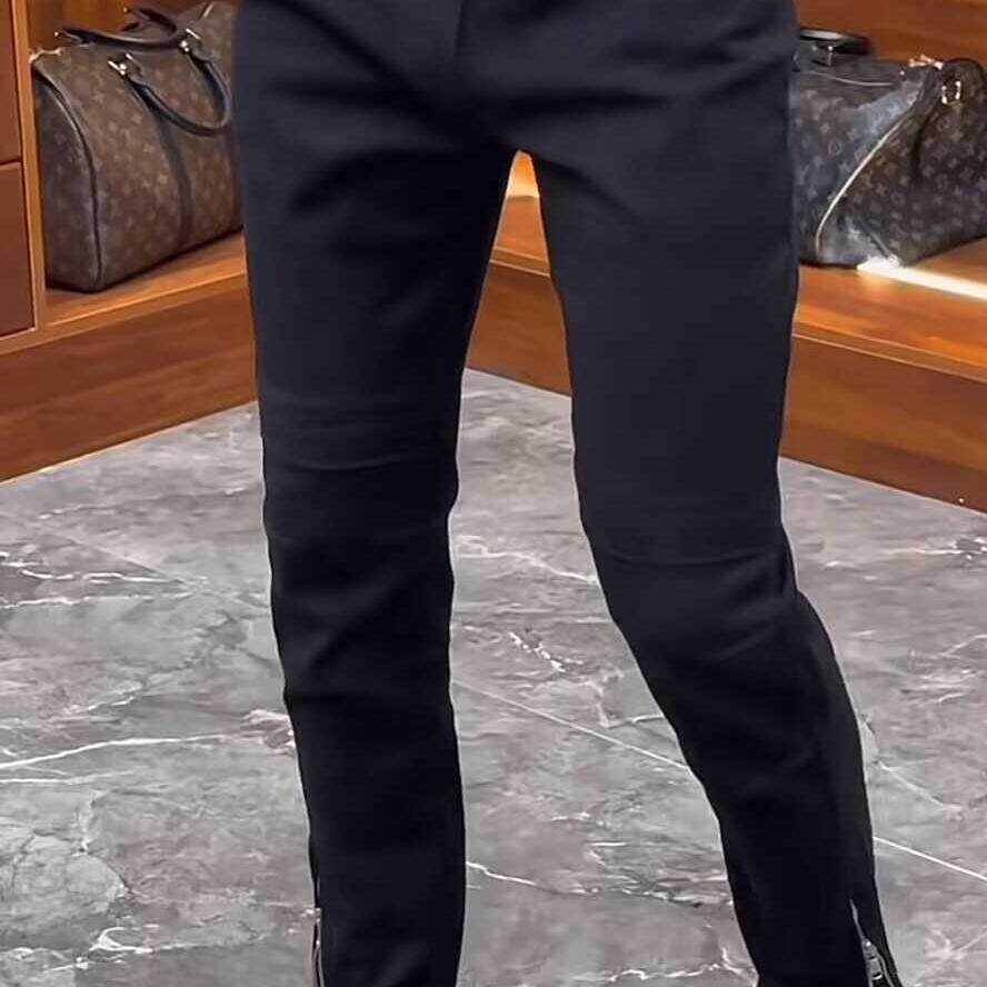 高端简约脚口侧边拉链装饰牛仔裤男黑色秋季百搭弹力修身小脚裤子