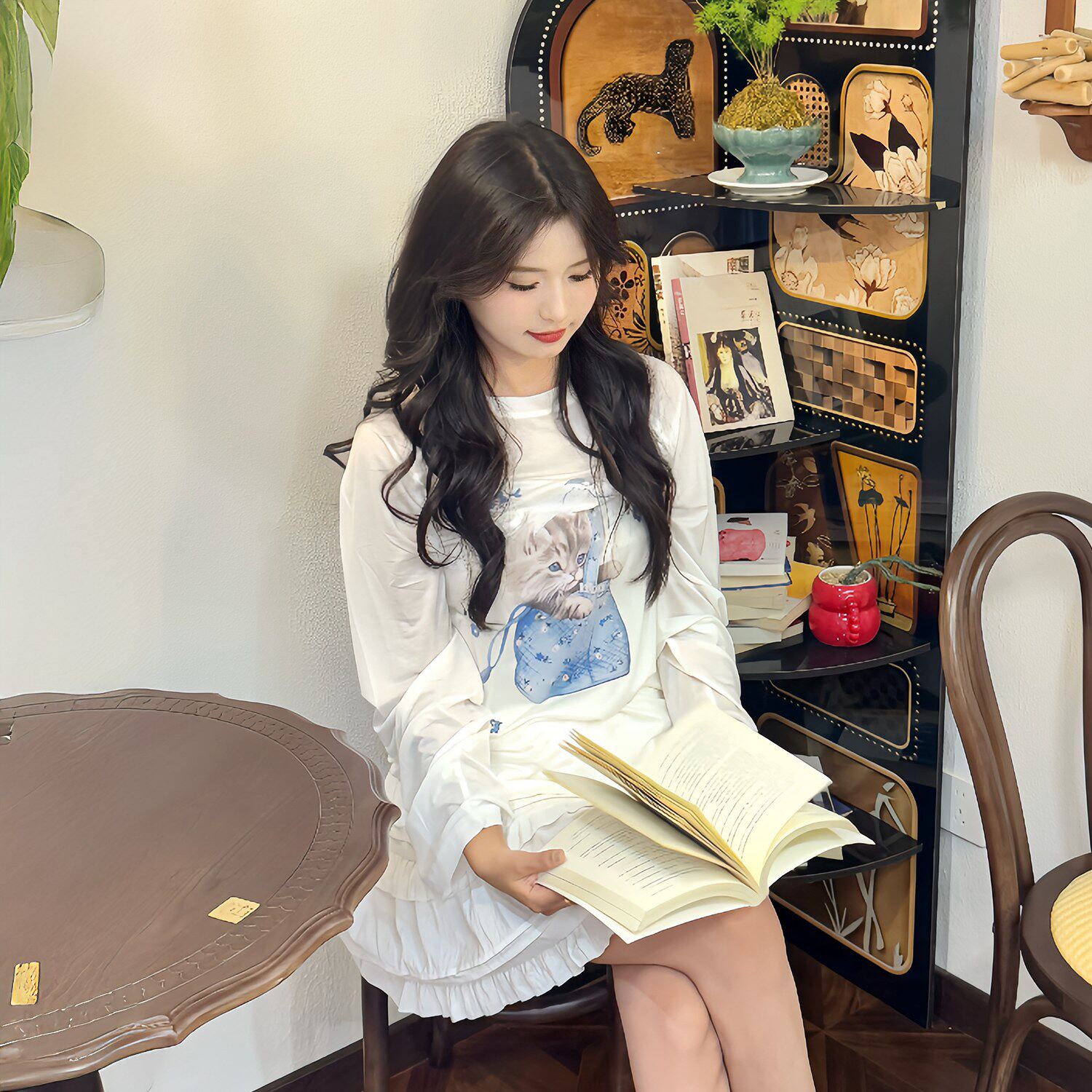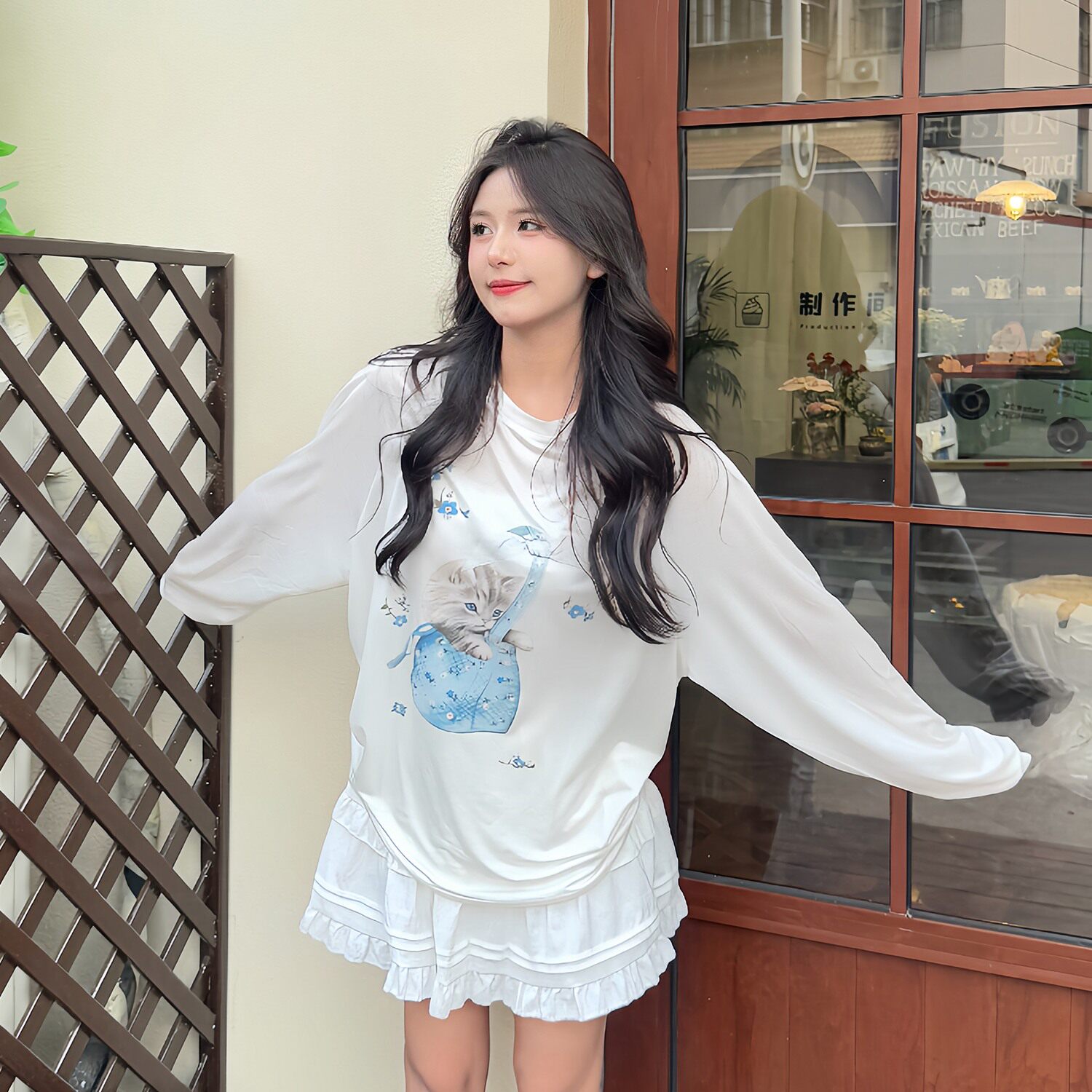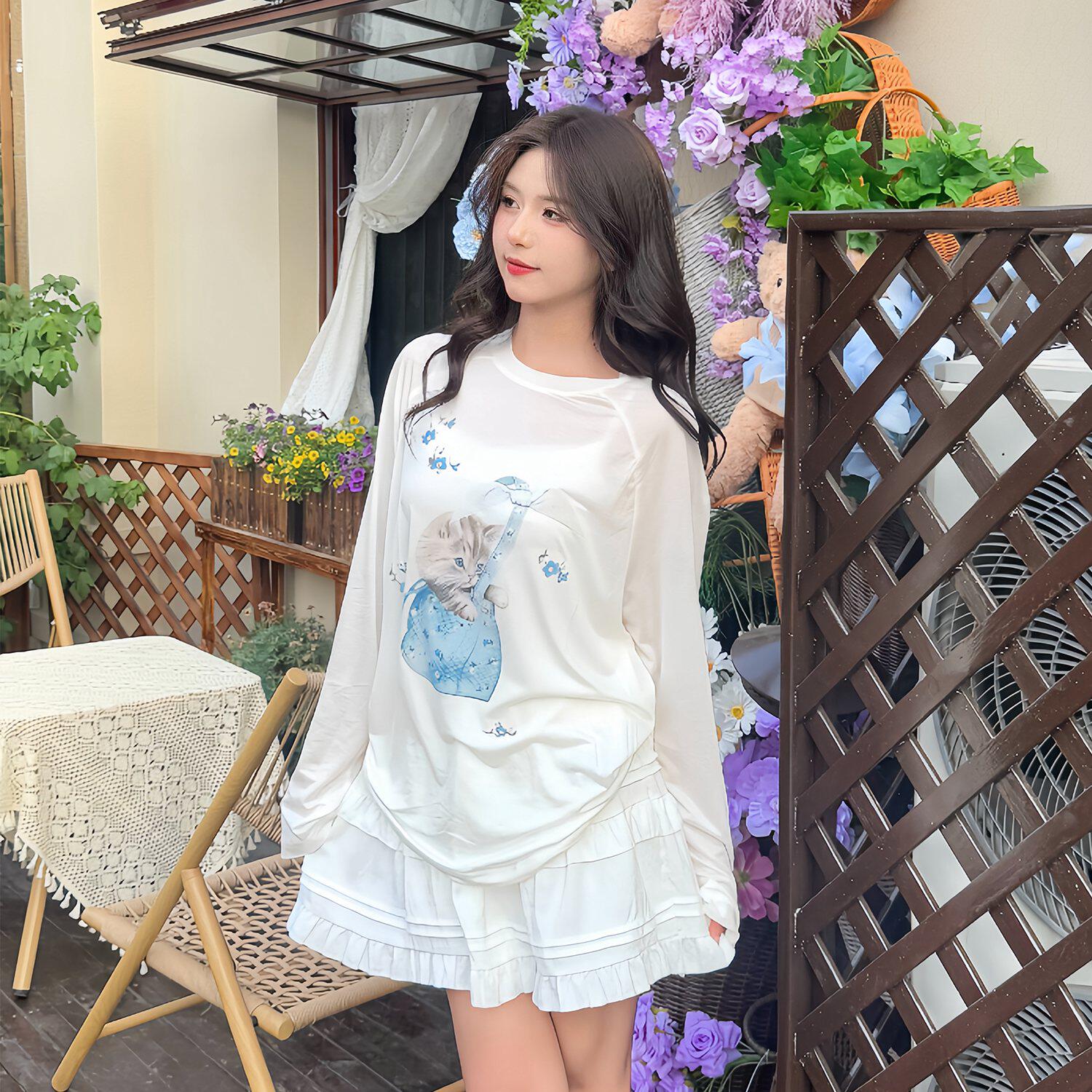 HTCU 安迪猫咪碎花小猫印花薄款防晒插肩长袖罩衫女宽松T恤上衣