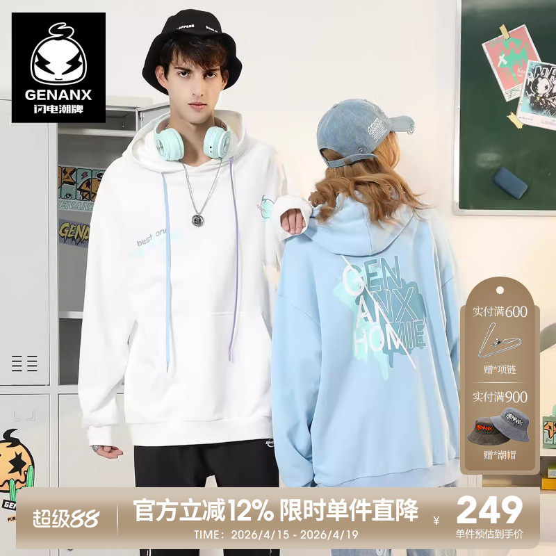 --------------------- GENANX闪电潮牌连帽情侣蓝色卫衣男女春秋季新款百搭国潮白色上衣 【原售价】299元 【现售价】249元 【推荐理由】