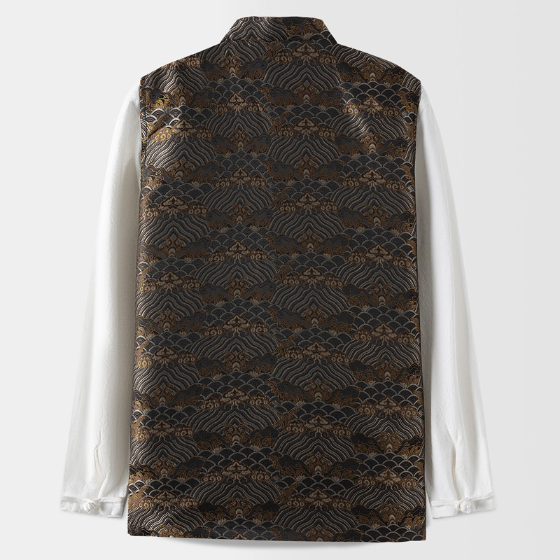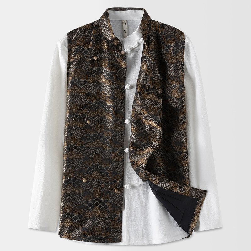 --------------------- 秋季唐装男无袖坎肩男士宽松国潮海水纹提花背心马褂中国风马甲男 【原售价】438元 【现售价】209元 【推荐理由】