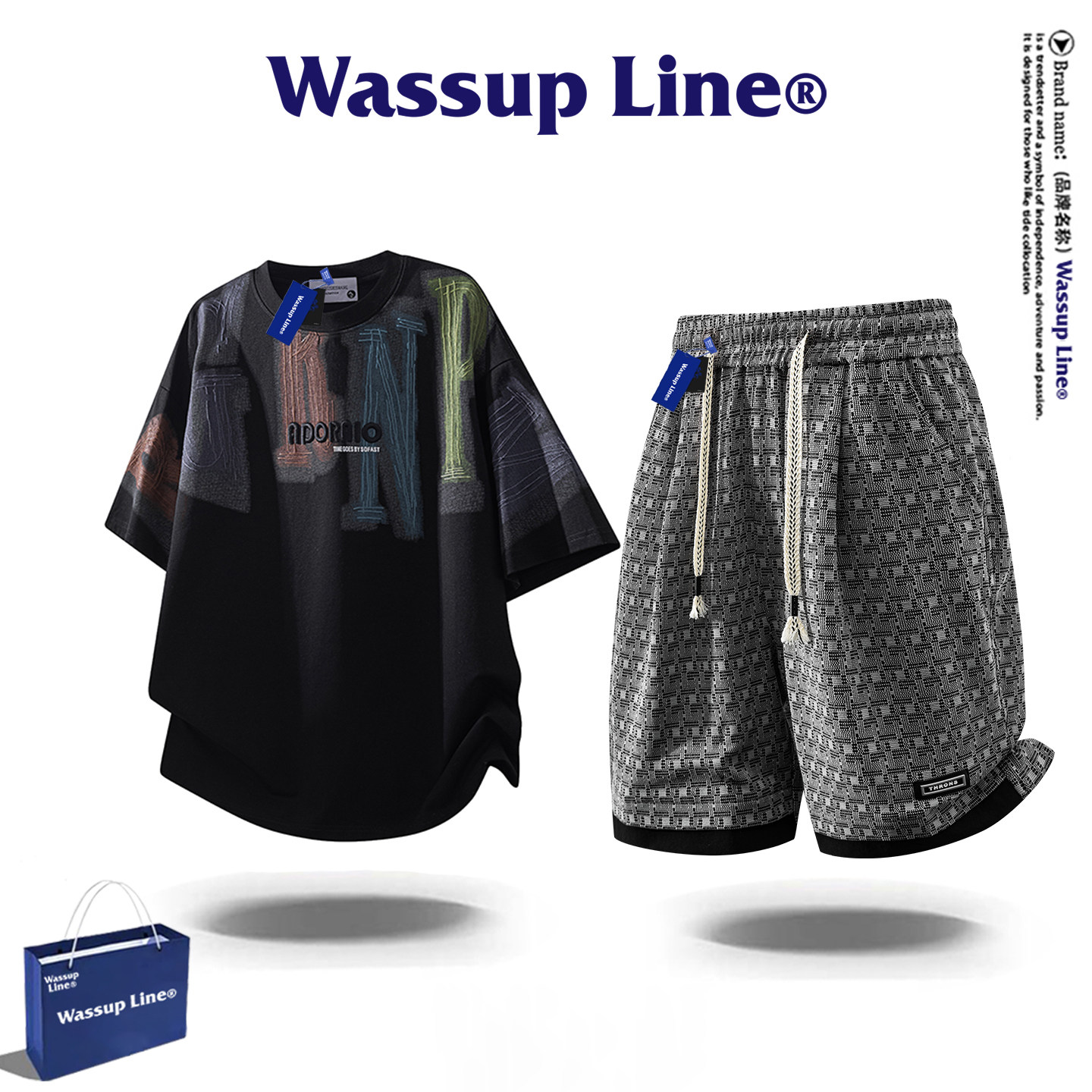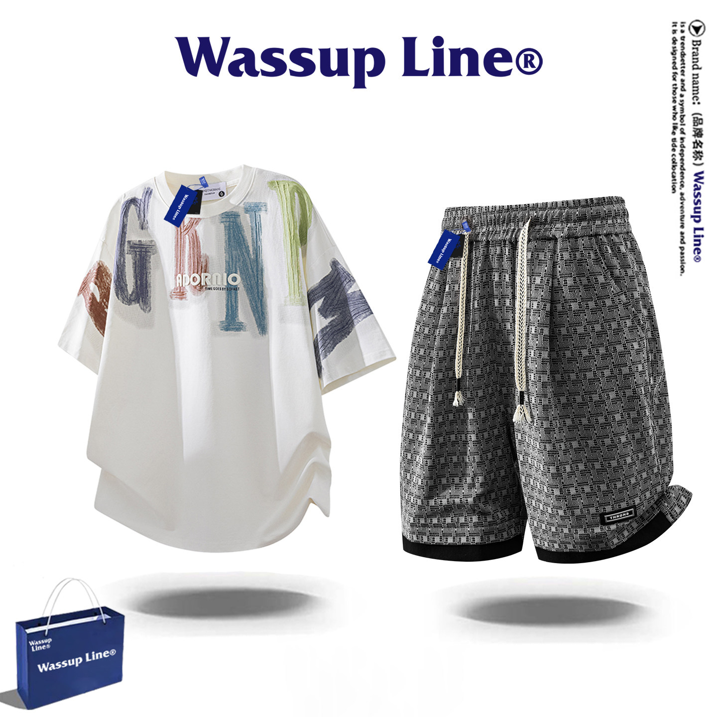 WASSUP Line潮牌运动套装男款美式休闲短袖T恤夏季沙滩短裤两件套