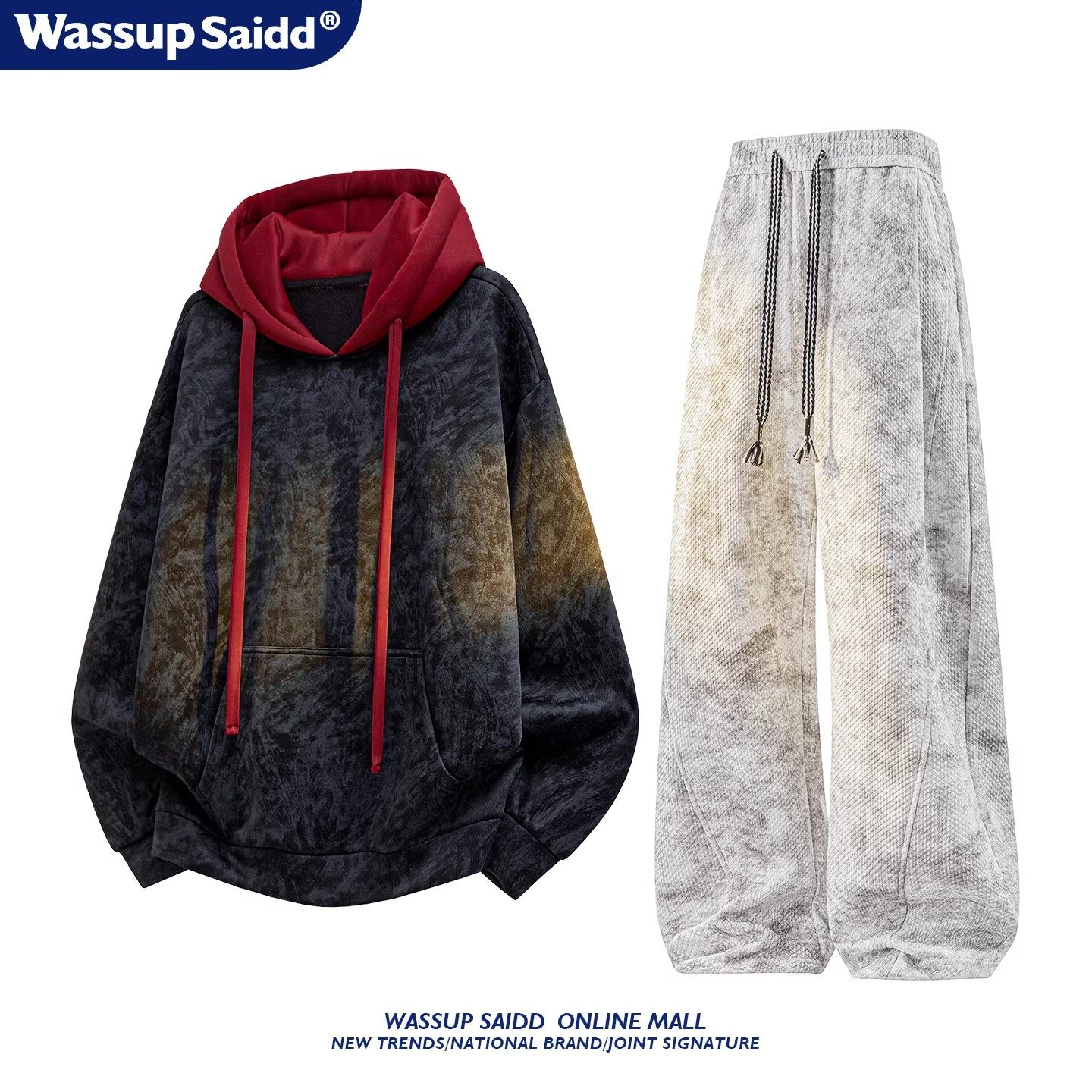 WASSUP SAIDD扎染美式连帽卫衣男春秋运动套装宽松男款休闲长裤潮