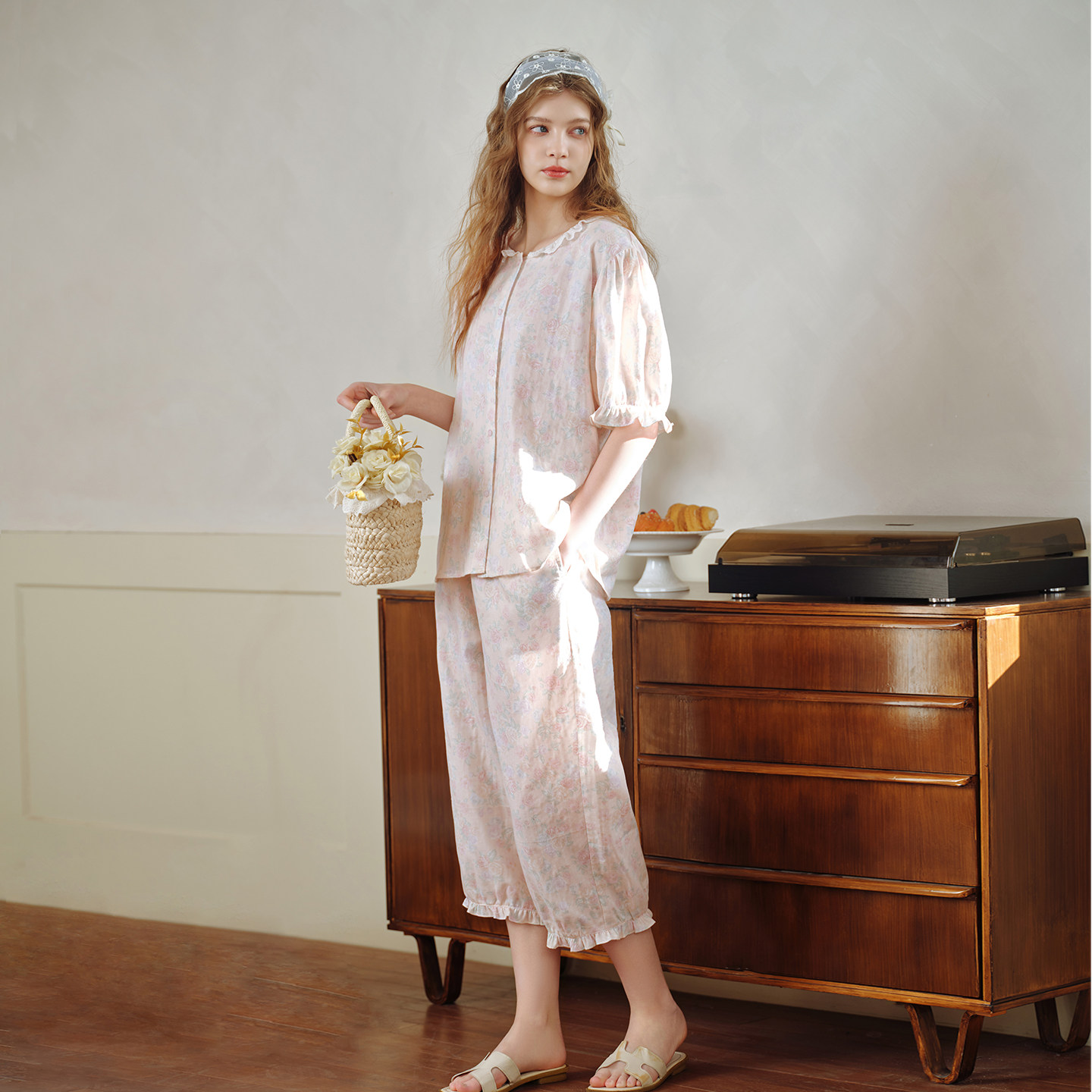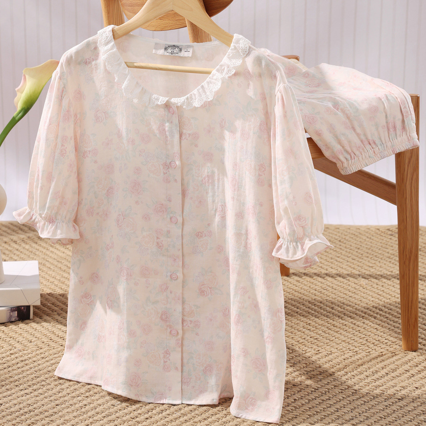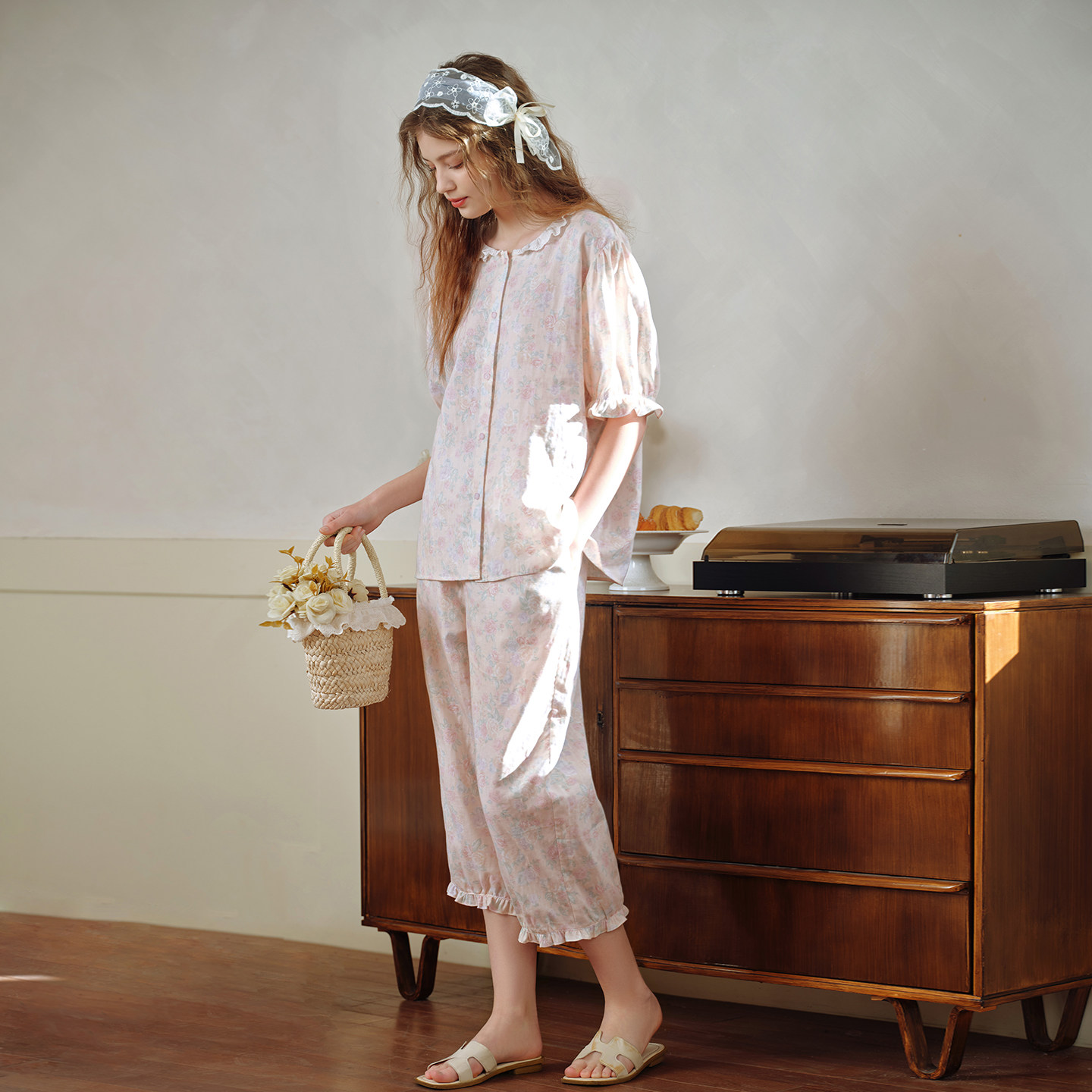 美标春夏新款短袖纯棉睡衣套装女甜美公主风全棉质双层棉纱家居服