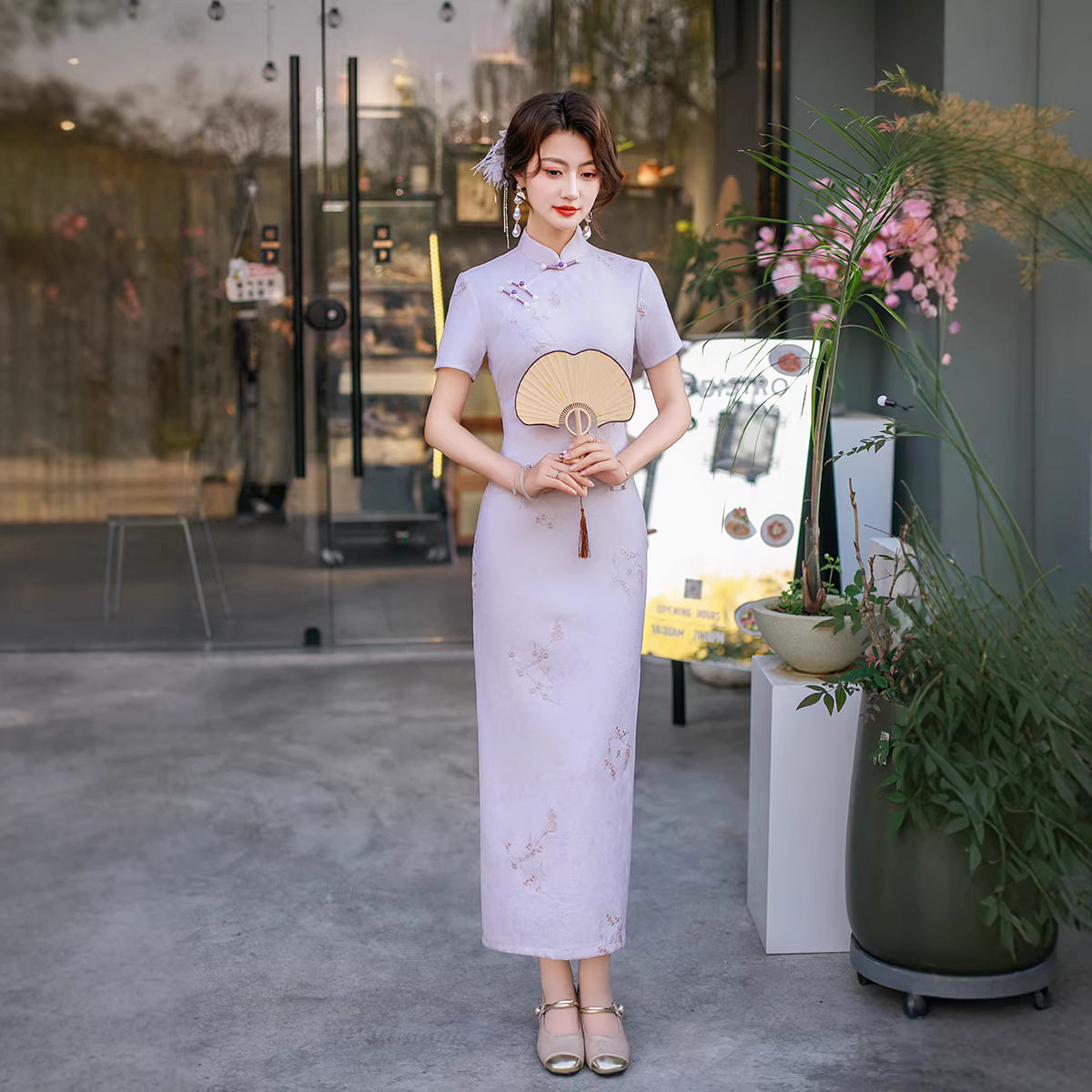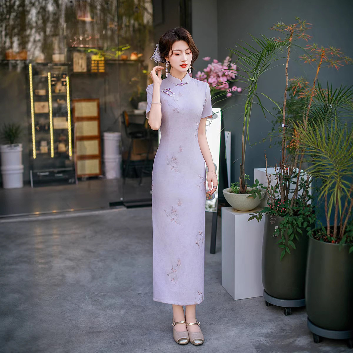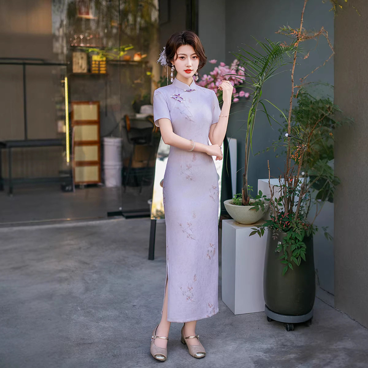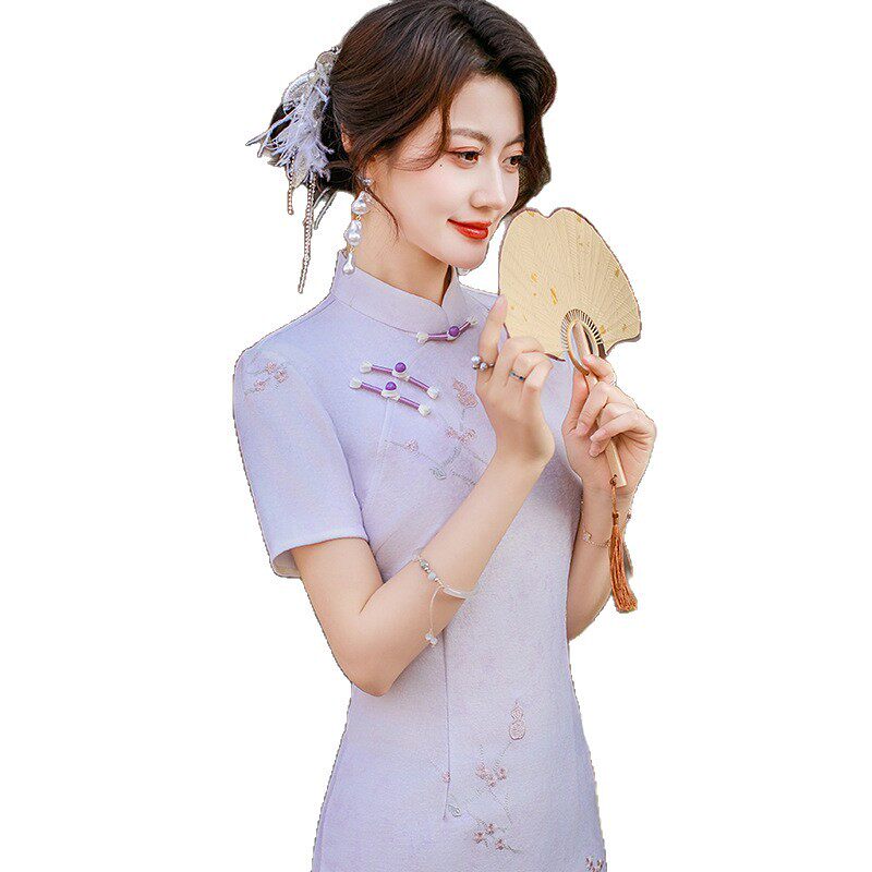 淘宝金陵十三钗复古风淡紫色改良旗袍女短袖修身显瘦中国风中长裙刺绣