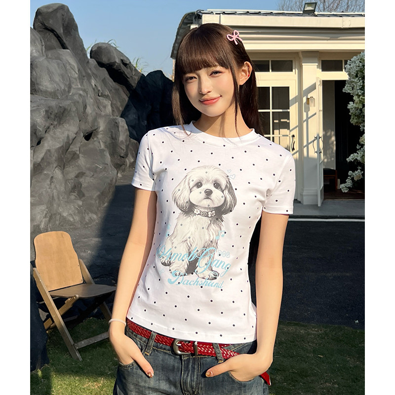 404MOB美式满印波点印花小狗短袖T恤女款显瘦弹力短款辣妹上衣夏