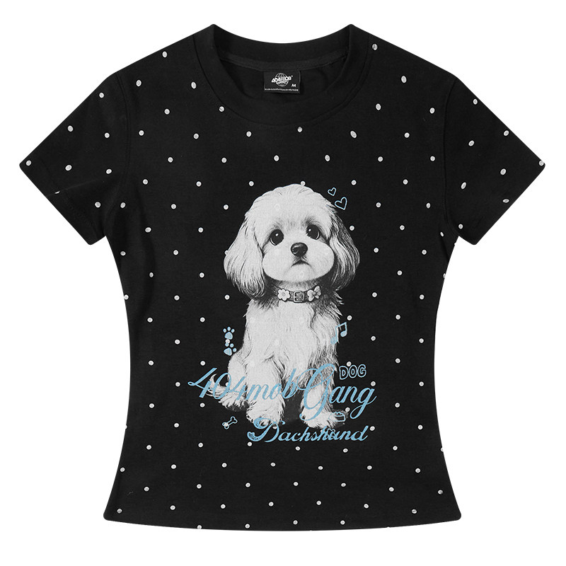 --------------------- 404MOB美式满印波点印花小狗短袖T恤女款显瘦弹力短款辣妹上衣夏 【原售价】130元 【现售价】89元 【推荐理由】