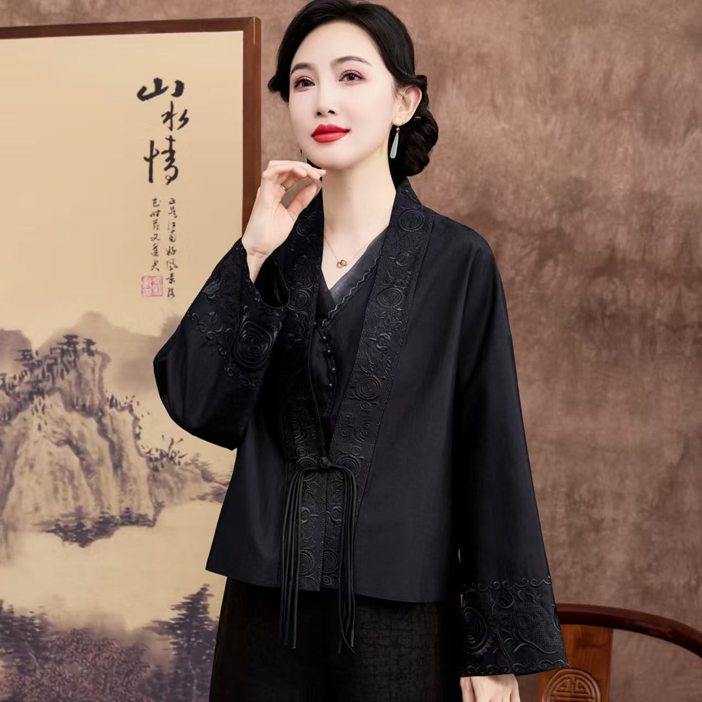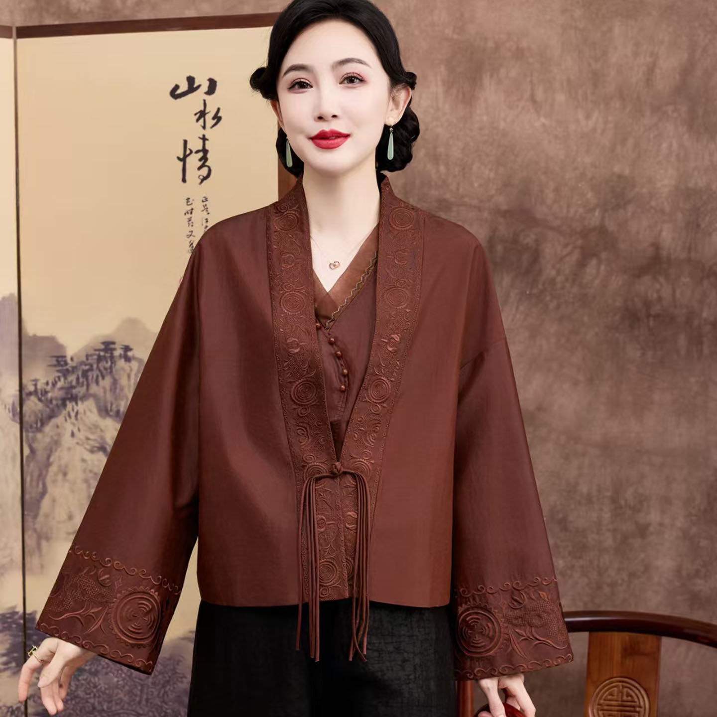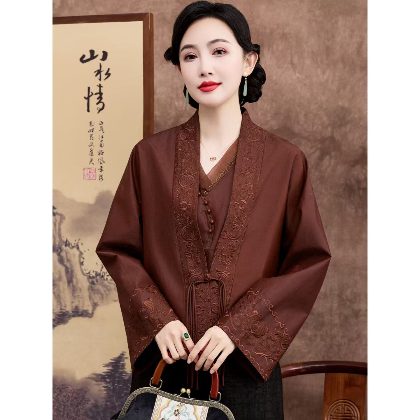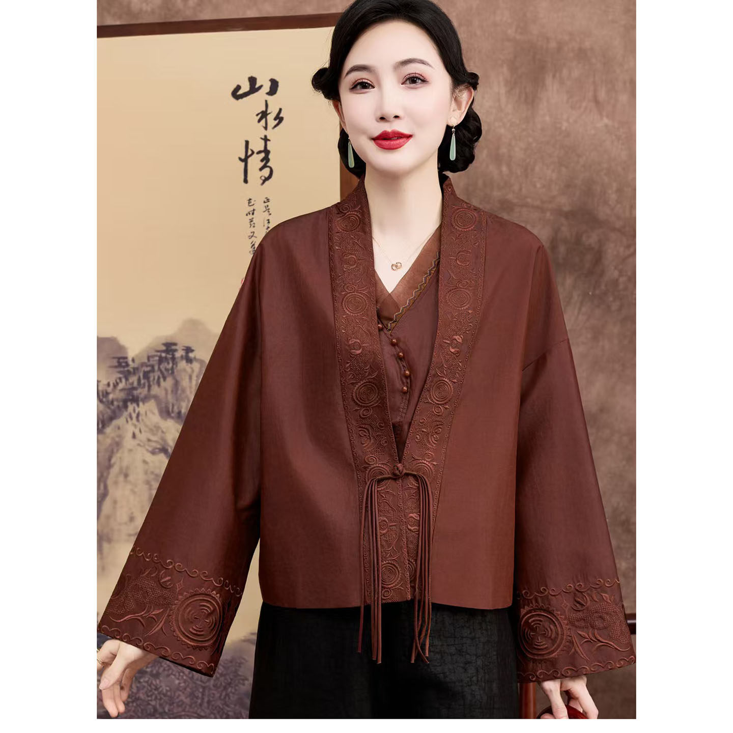 --------------------- 重磅真丝桑蚕丝香云纱高端女外套年轻款妈妈装刺绣宽松上衣新中式 【原售价】1149元 【现售价】1149元 【推荐理由】