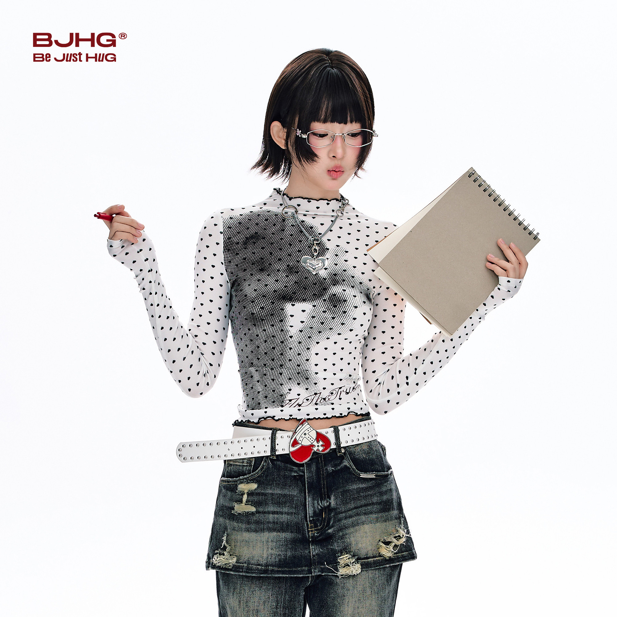FTT Flythetruth辣妹小狗波点印花长袖t恤女春季半高领内搭打底衫
