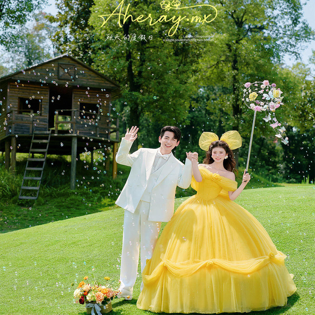 影楼新款婚纱礼服黄色一字肩公主裙摄影拍照主题外景油画复古写真