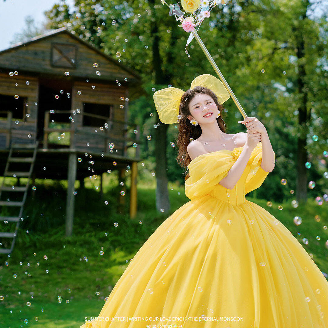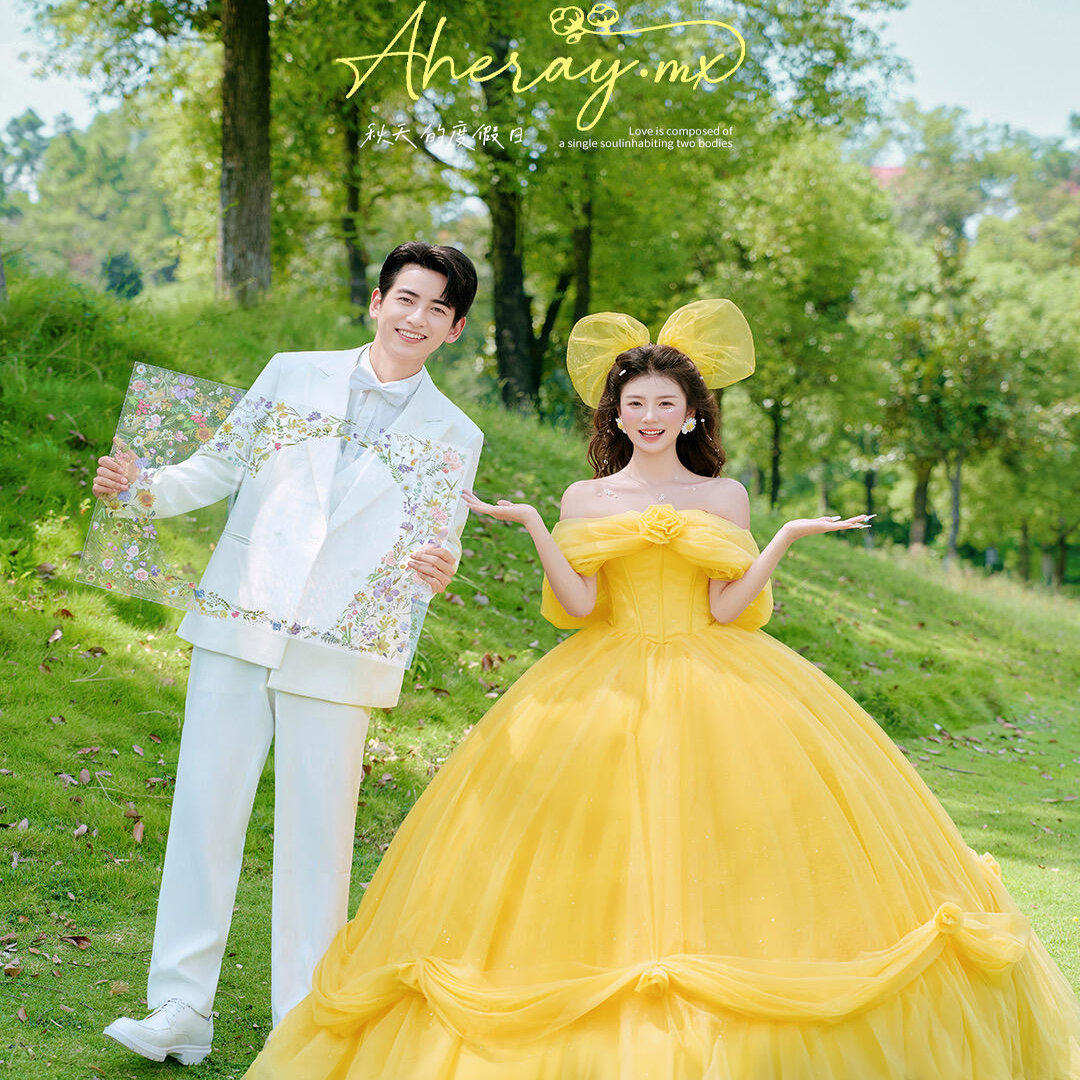 --------------------- 影楼新款婚纱礼服黄色一字肩公主裙摄影拍照主题外景油画复古写真 【原售价】399元 【现售价】399元 【推荐理由】