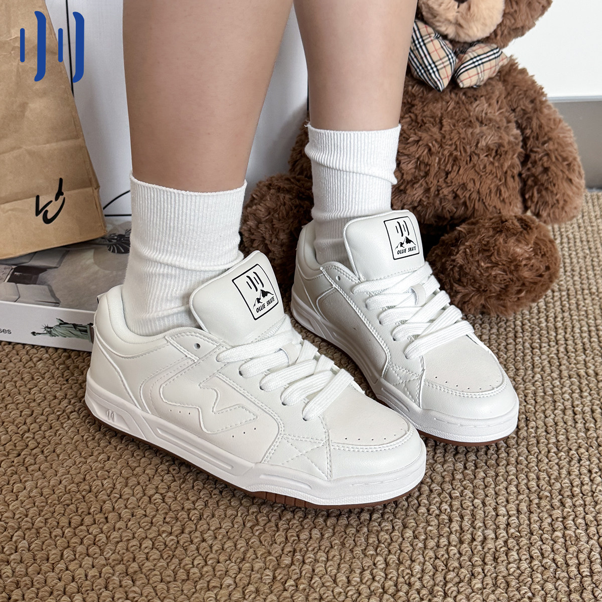 顽刻官方白色纯色皮质W系列复古休闲低帮男女国潮冷粘滑板鞋