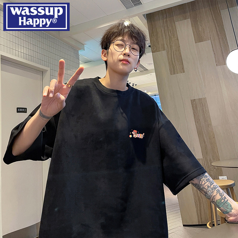 wassup happy小狗麂皮绒短袖t恤男士夏季新款宽松休闲半袖体恤衫