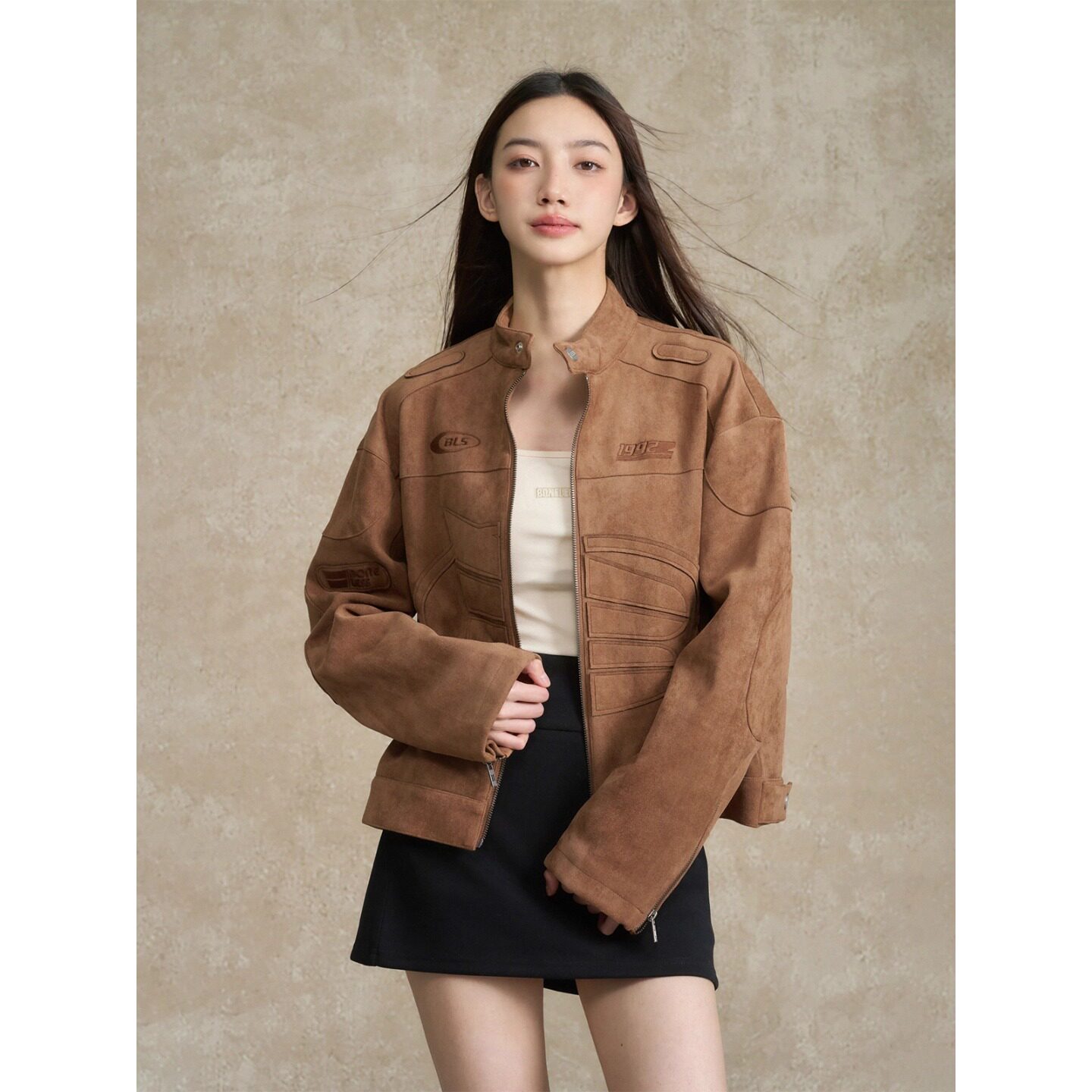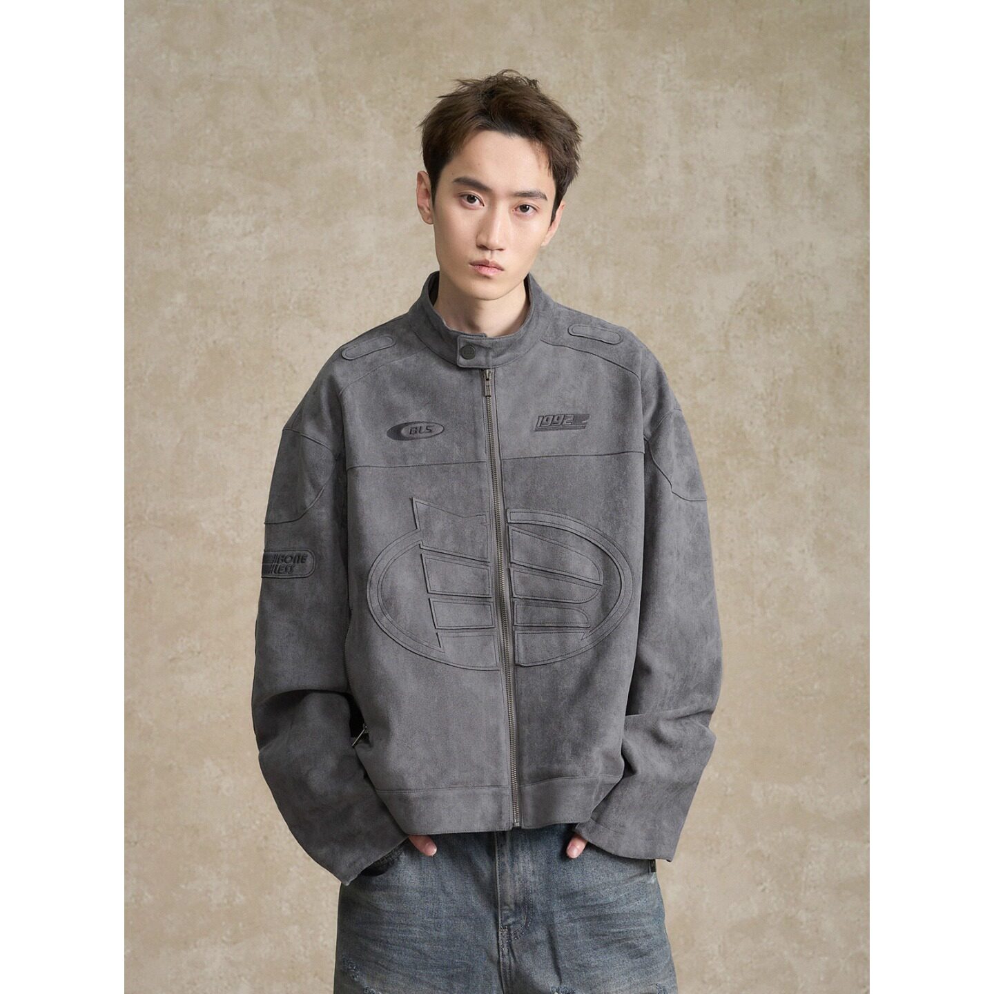 --------------------- BONELESS刺绣logo麂皮机车夹克秋季美式高街休闲翻领复古外套男 【原售价】599元 【现售价】479元 【推荐理由】