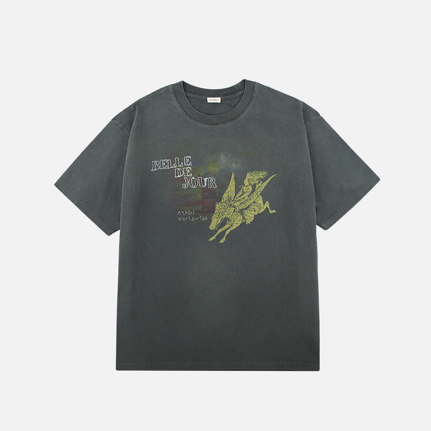 ATHIRI 美式复古标语图案印花水洗灰短袖T恤街头百搭T恤男女同款