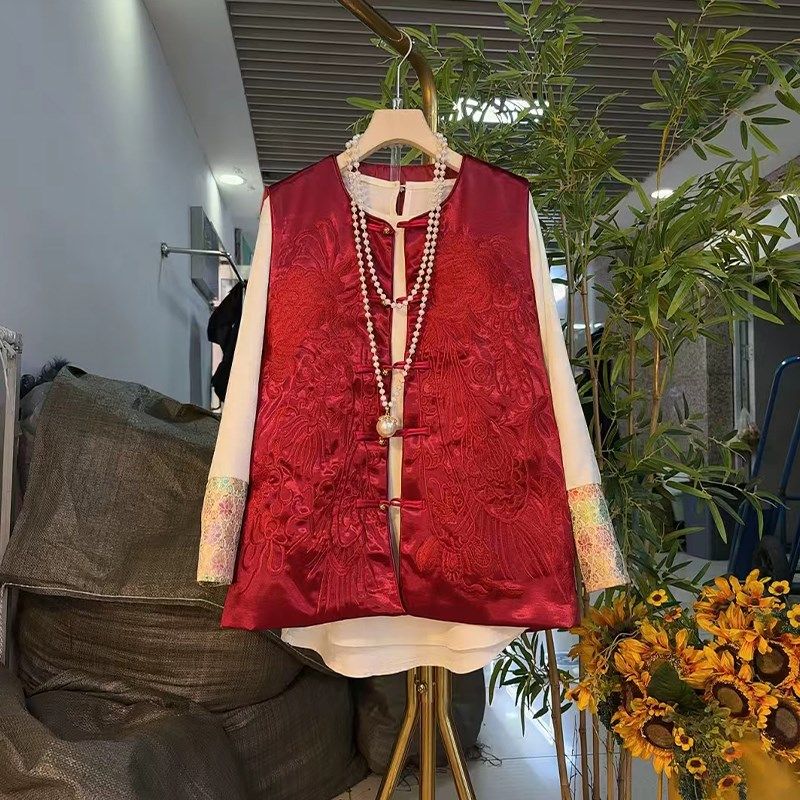 大码女装圆领盘扣暗花国风马甲胖MM秋冬款设计感花朵袖口长袖小衫