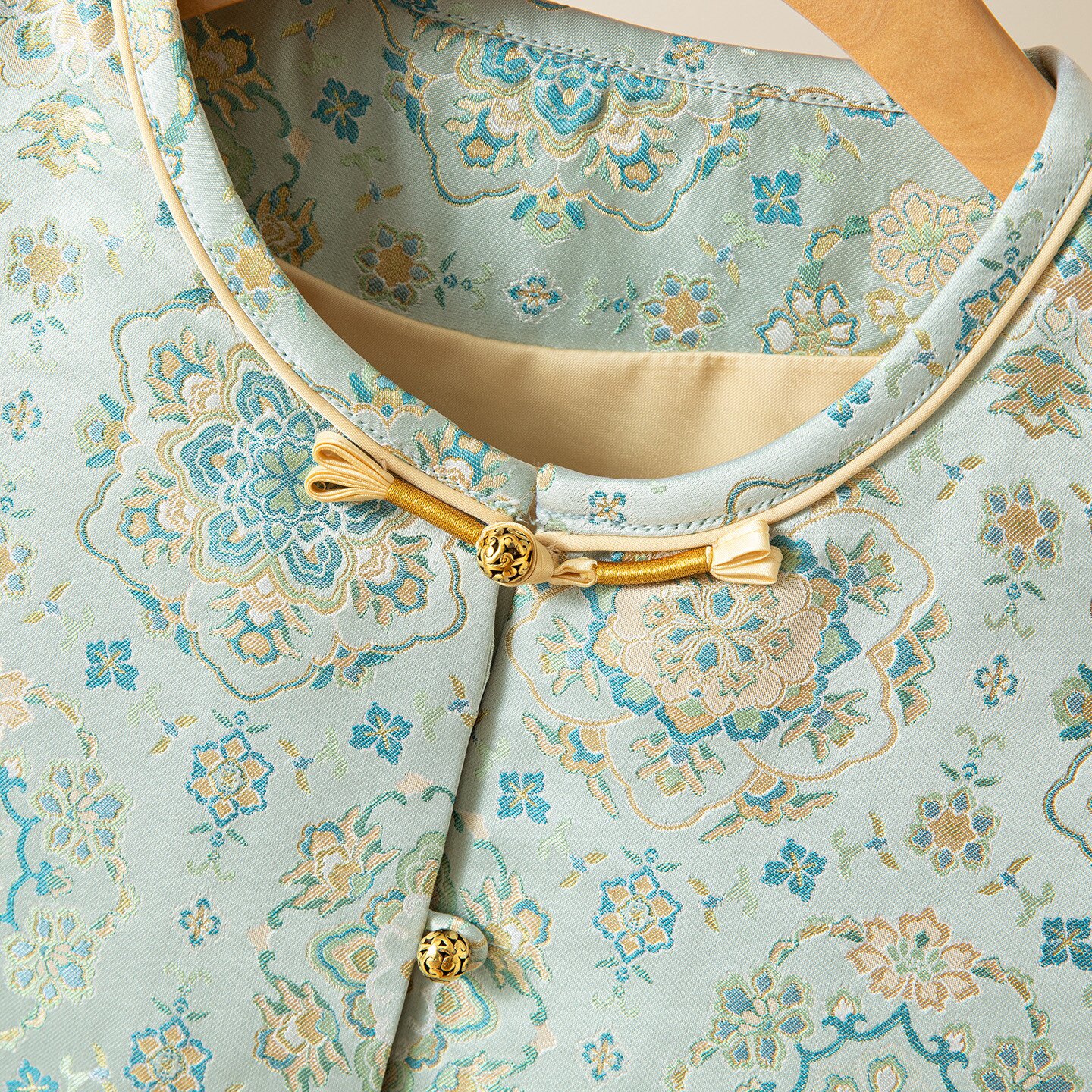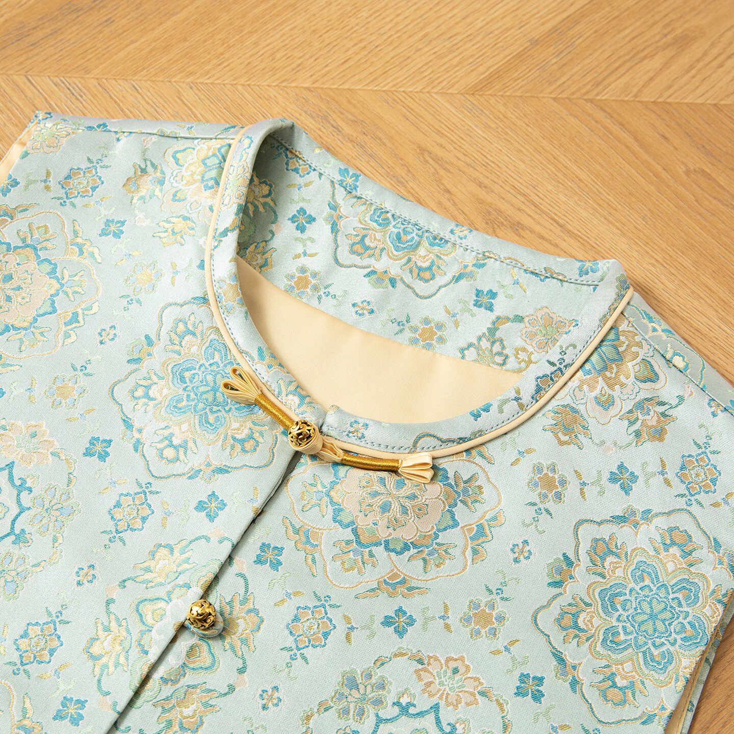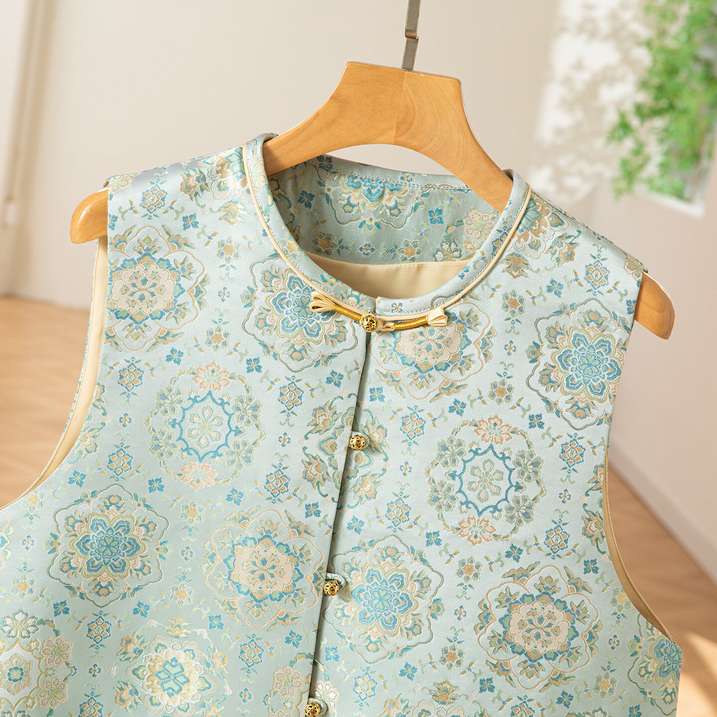 --------------------- 蓝宝相~真丝桑蚕丝宋锦对襟马甲圆领新中式国风女背心外穿上衣 【原售价】319元 【现售价】271元 【推荐理由】