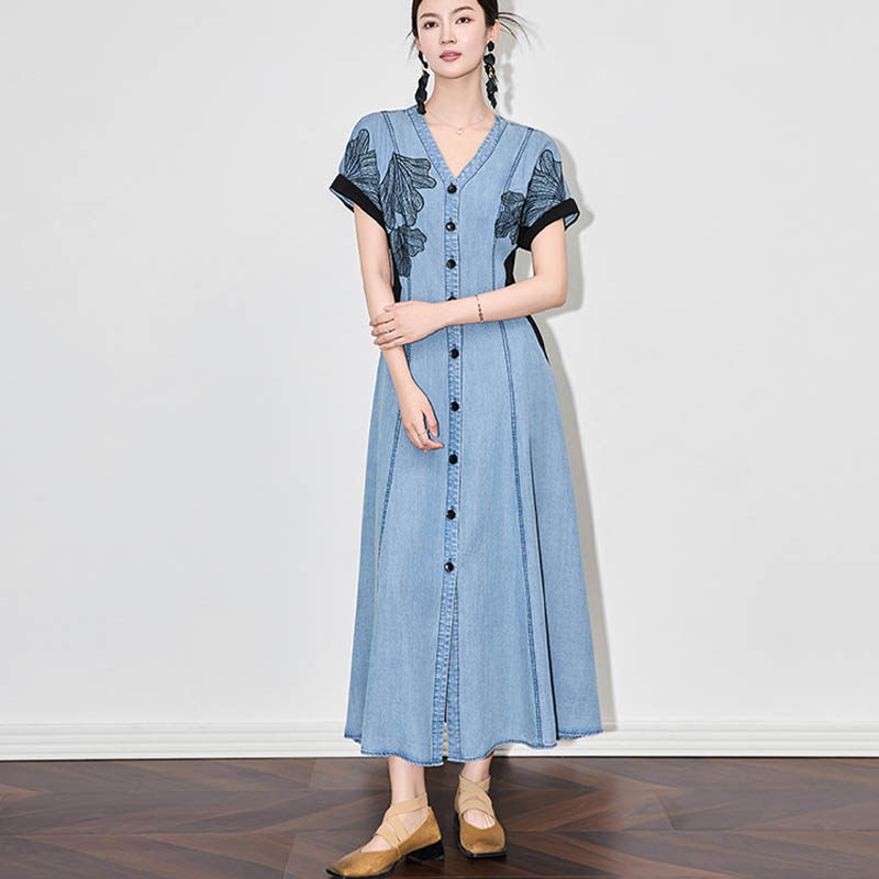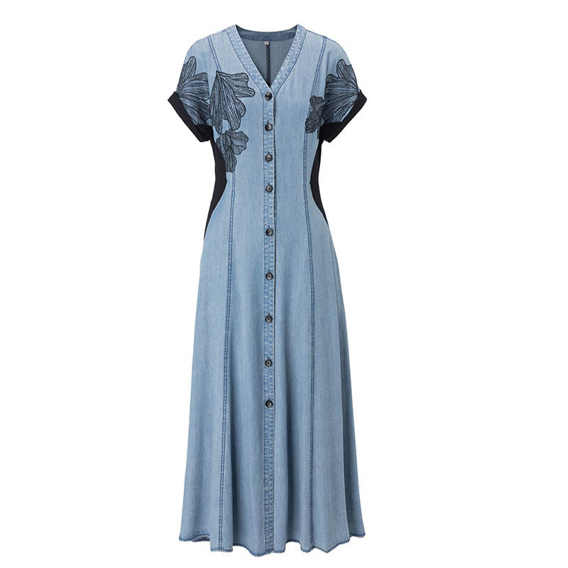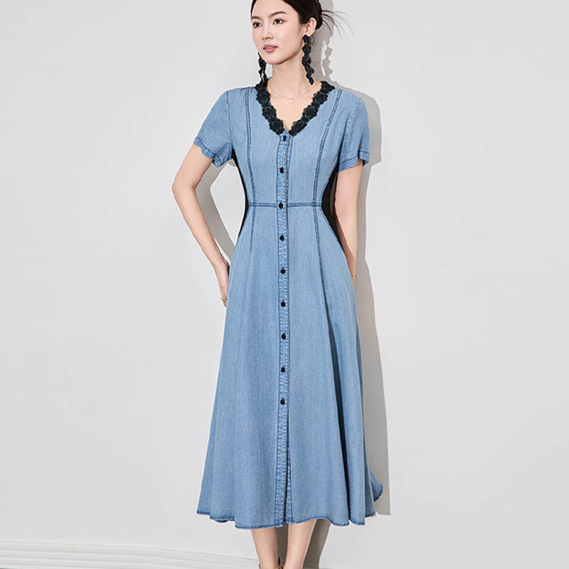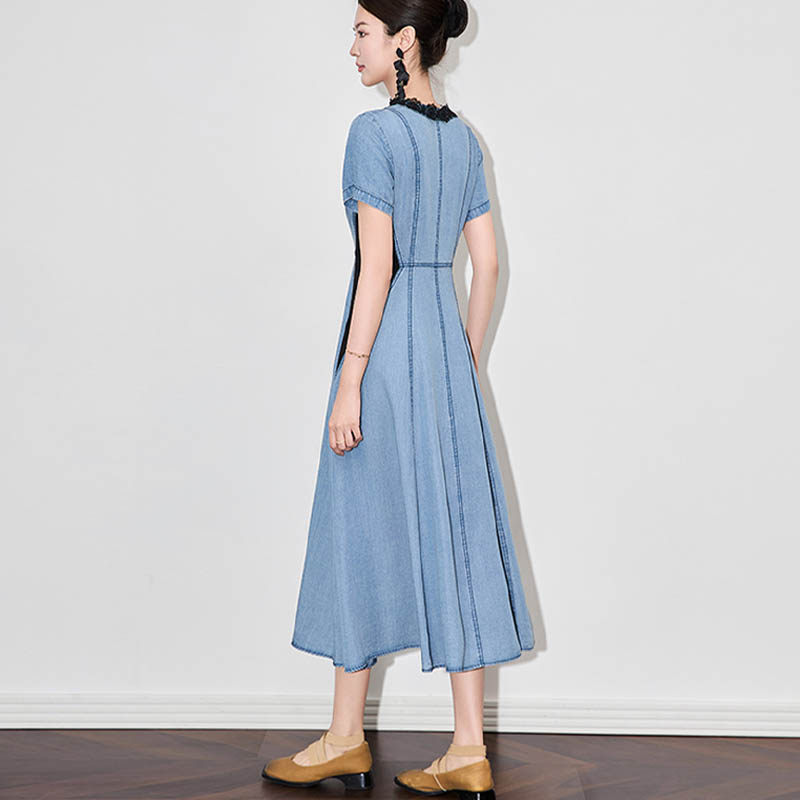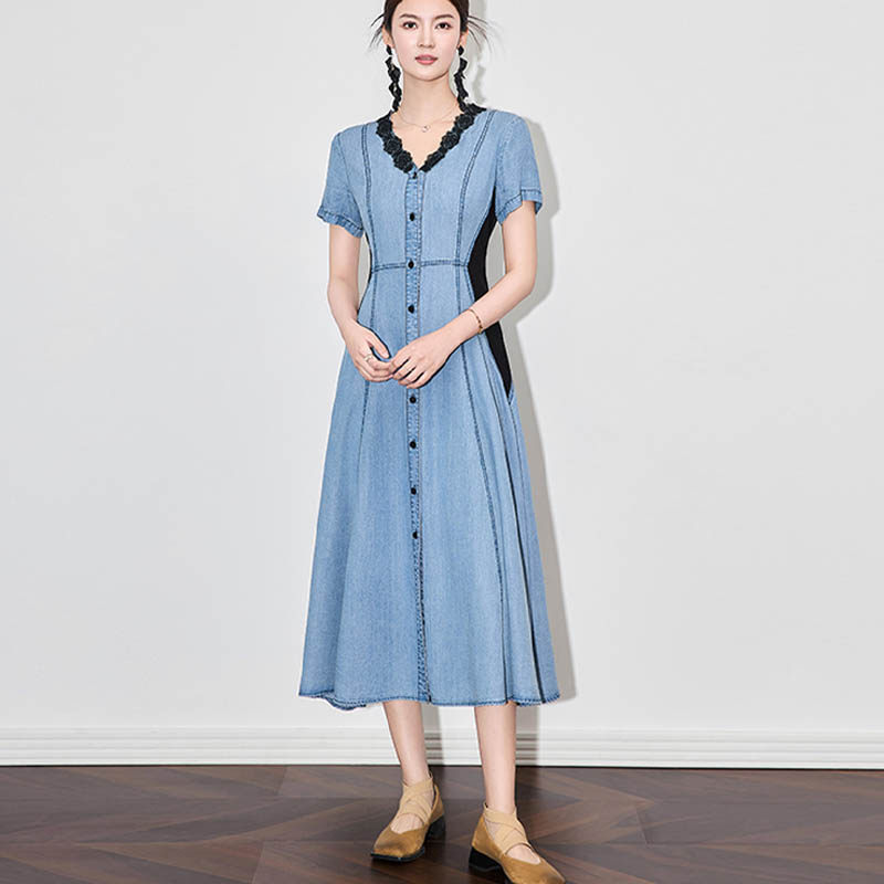 2026新款夏季显瘦天丝牛仔蕾丝拼接连衣裙复古中长款裙子女设计感
