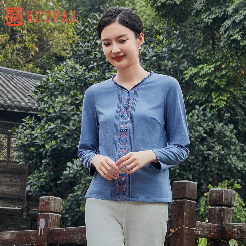 葵牌秋季新款原创中国风上衣时尚绣花民族风V领中年妈妈装长袖T恤