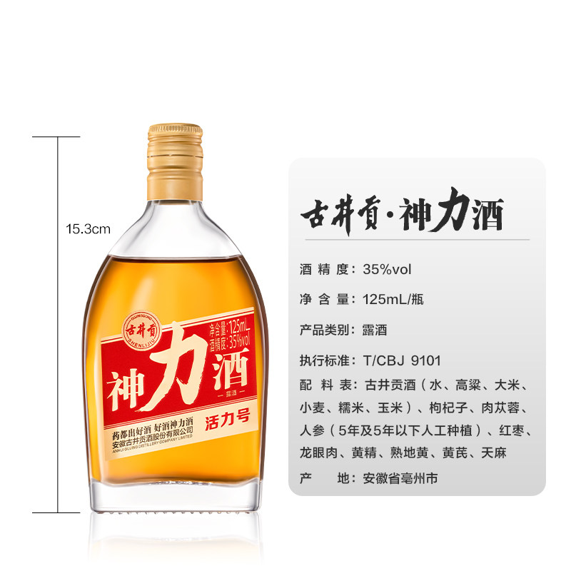 --------------------- 【新品】古井贡神力酒35度125ml*1瓶/24瓶整箱养生酒露酒古井酒庄 【原售价】49元 【现售价】20元 【推荐理由】