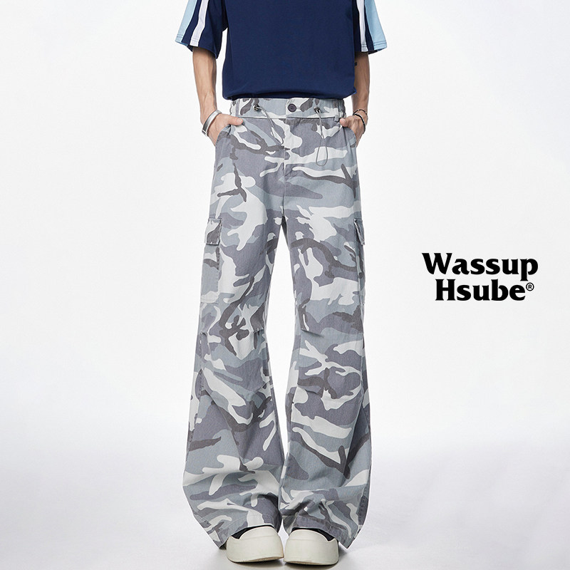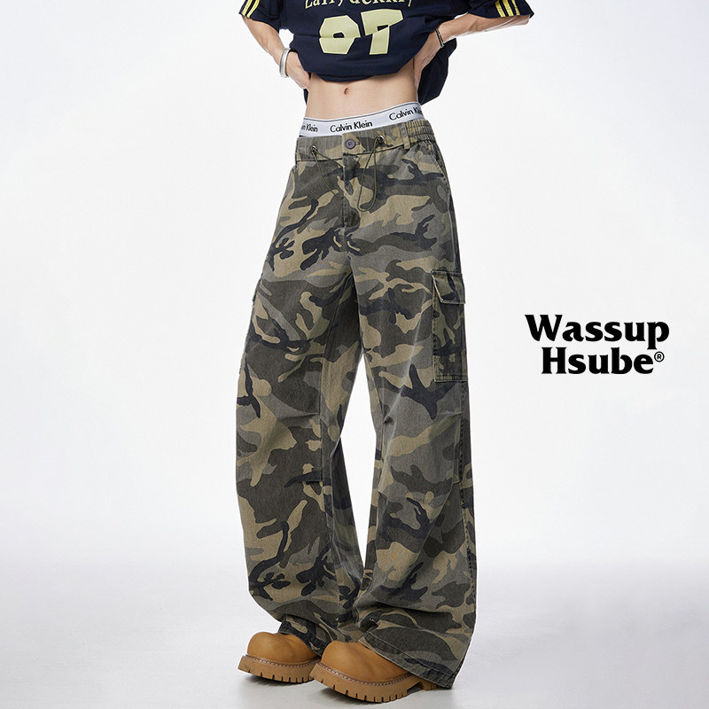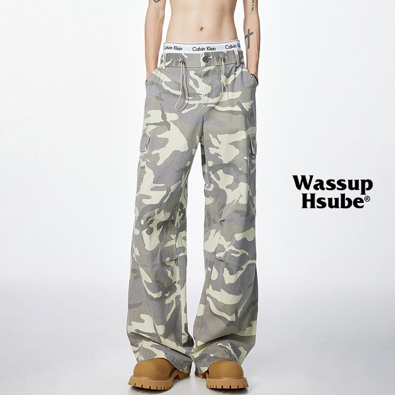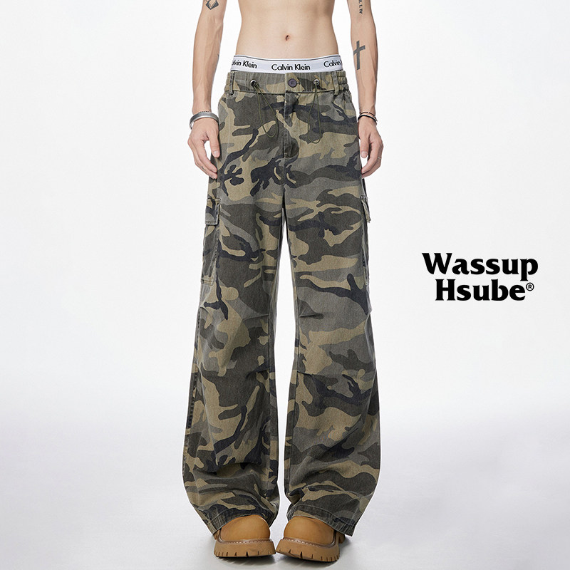 WASSUP HSUBE美式复古迷彩工装裤男款潮牌宽松直筒休闲阔腿长裤子