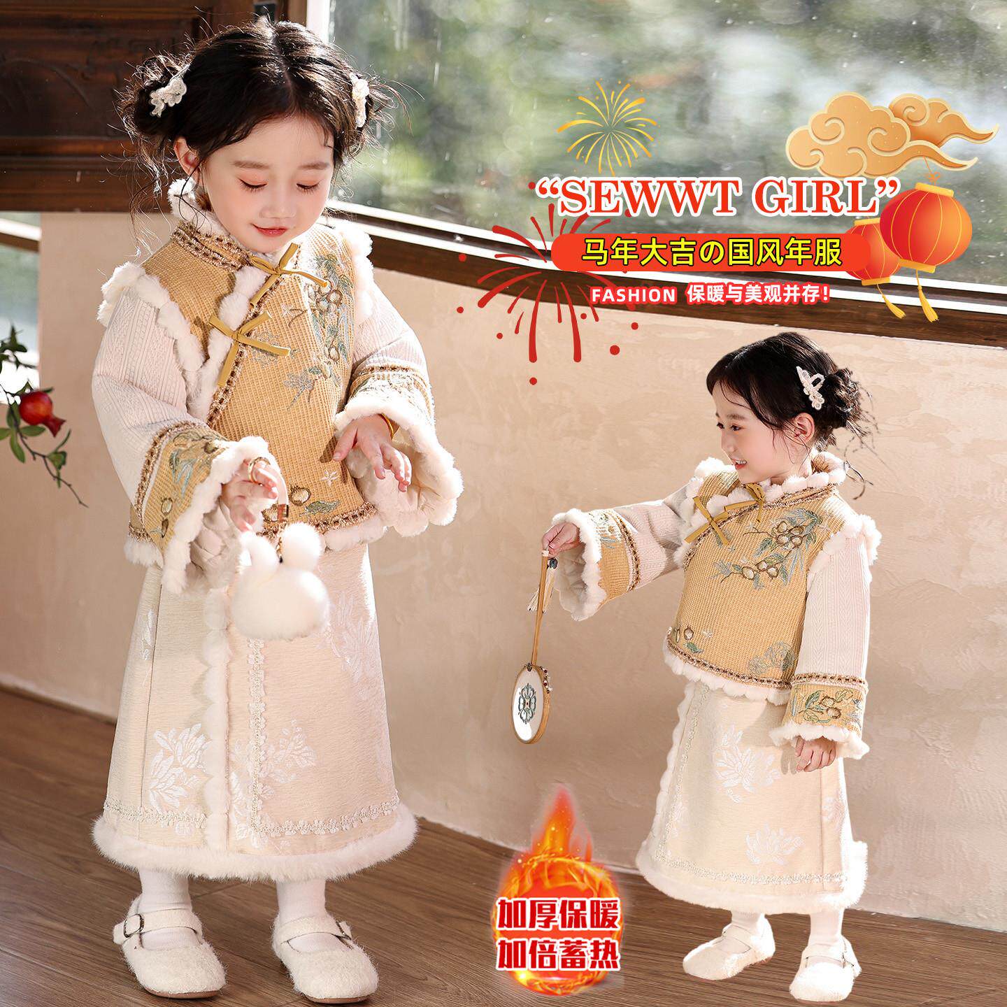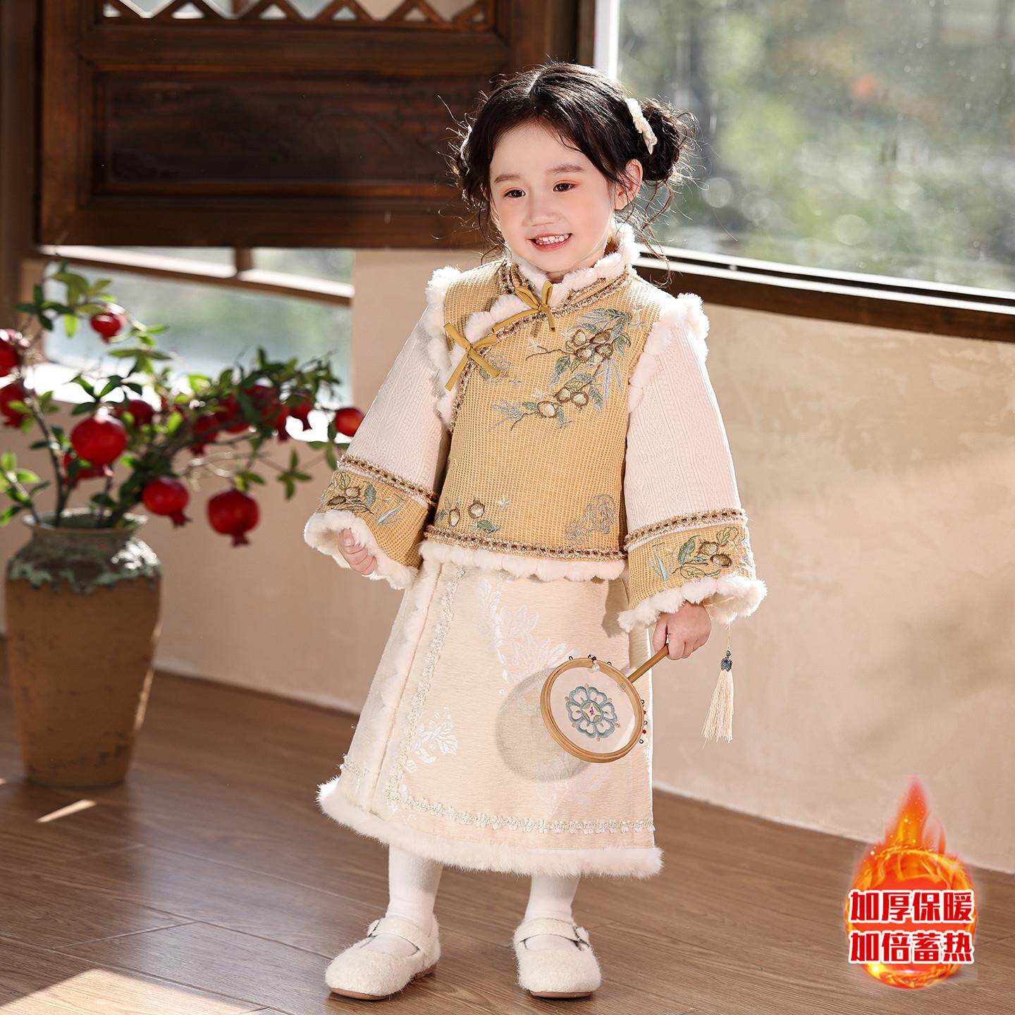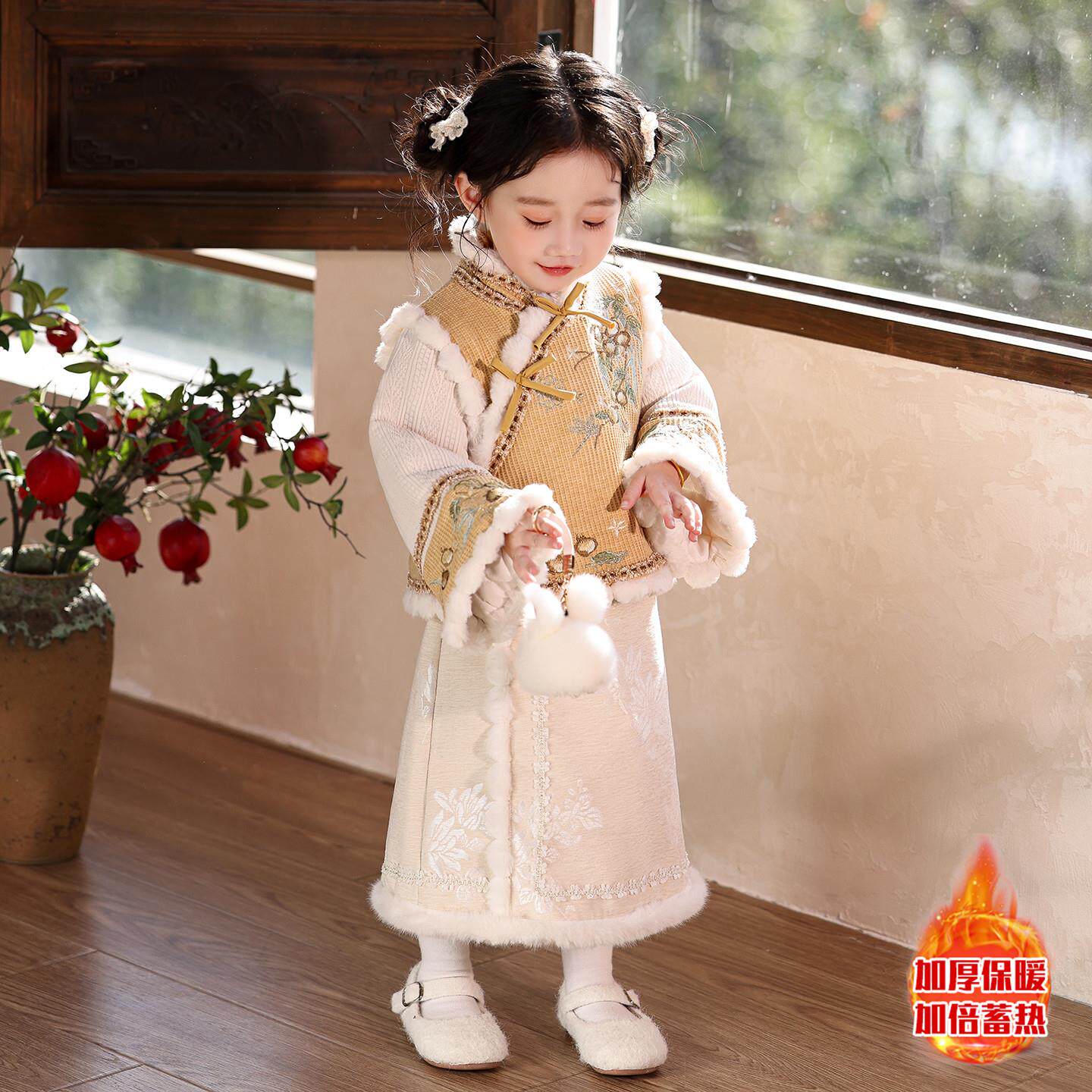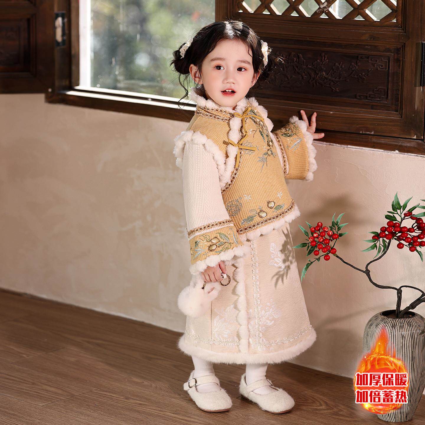 新中式女童汉服加绒加厚套装冬季唐装小女孩古风拜年服儿童新年装