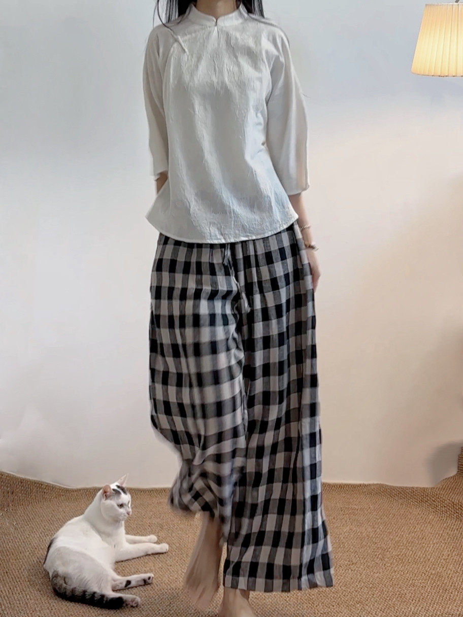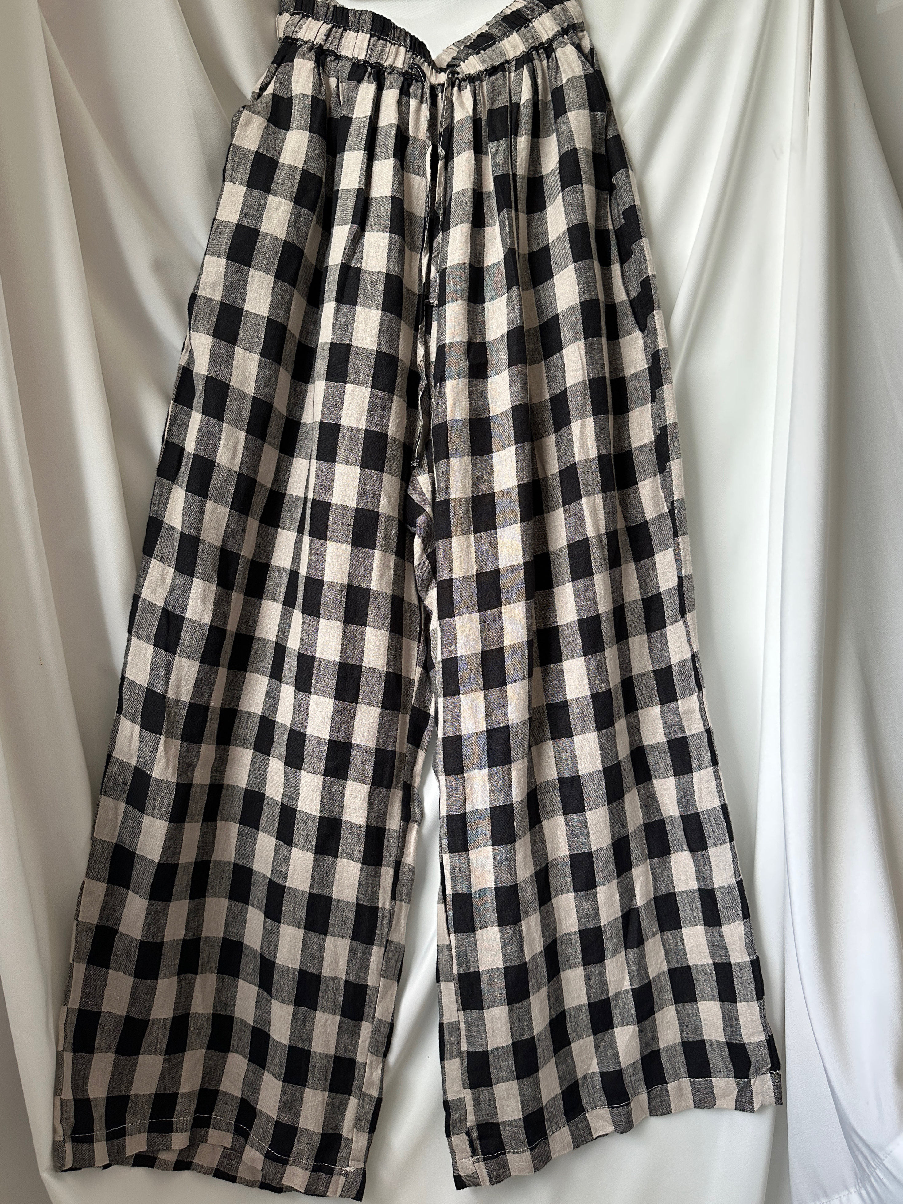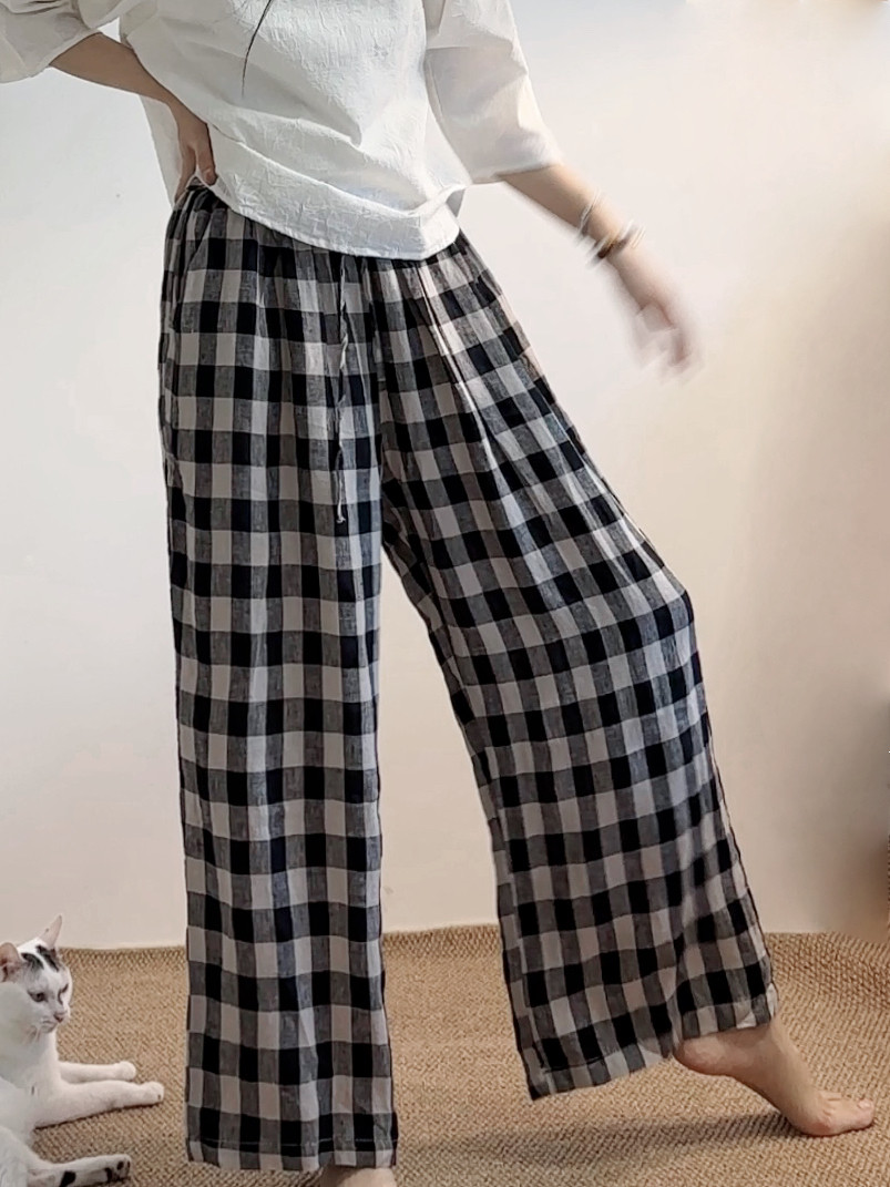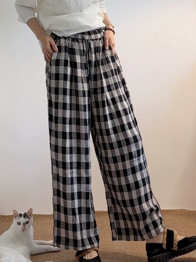 做旧黑白格亚麻直筒裤透气亲肤文艺显瘦长裤松紧腰显高慵懒格子裤