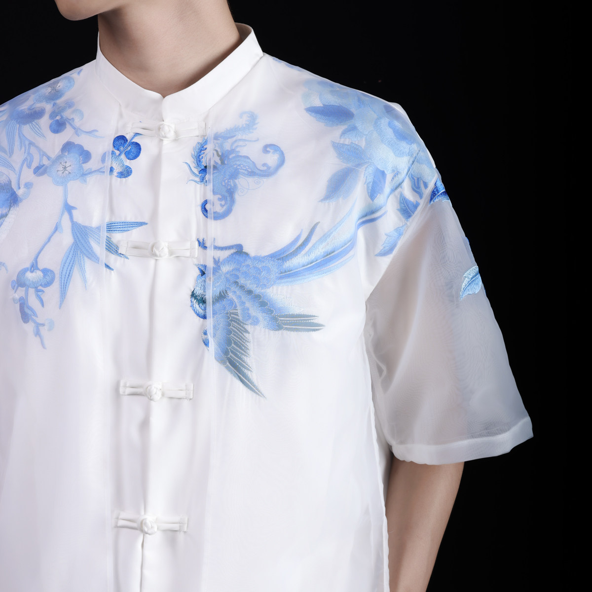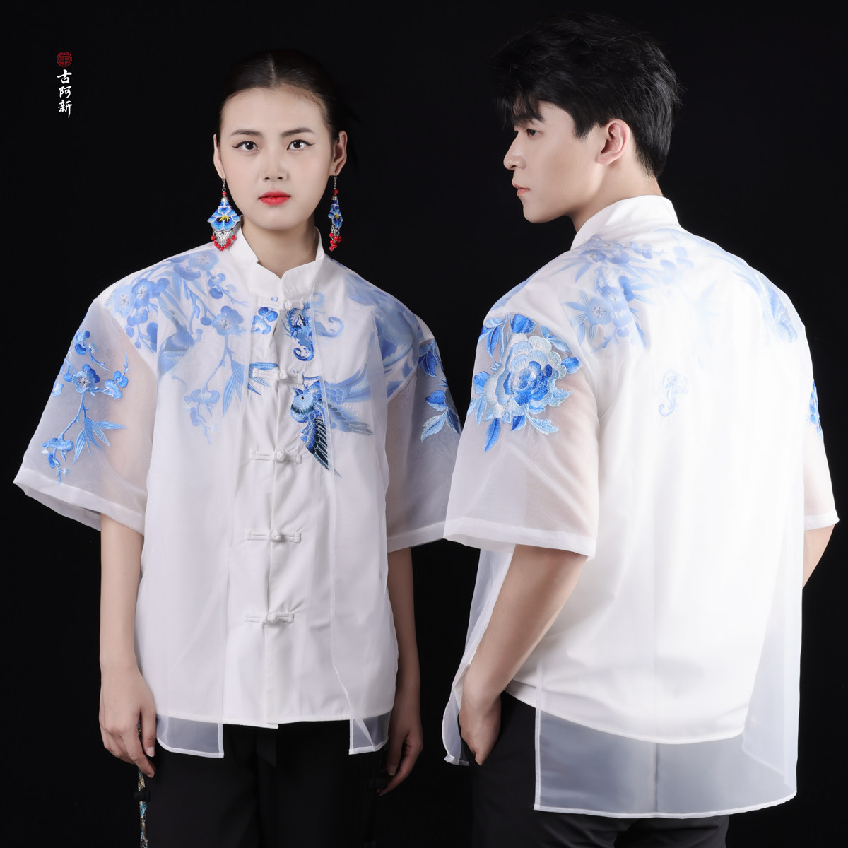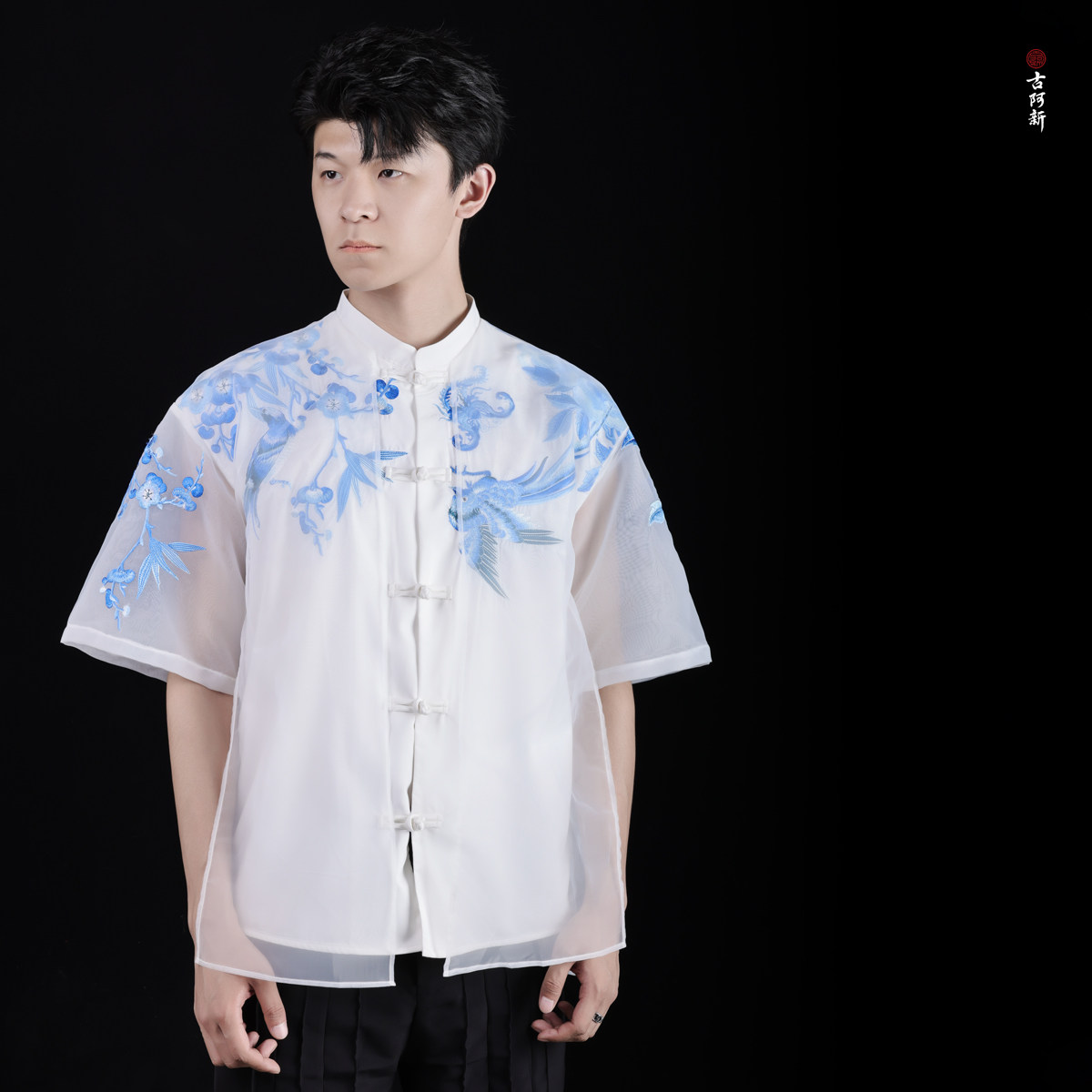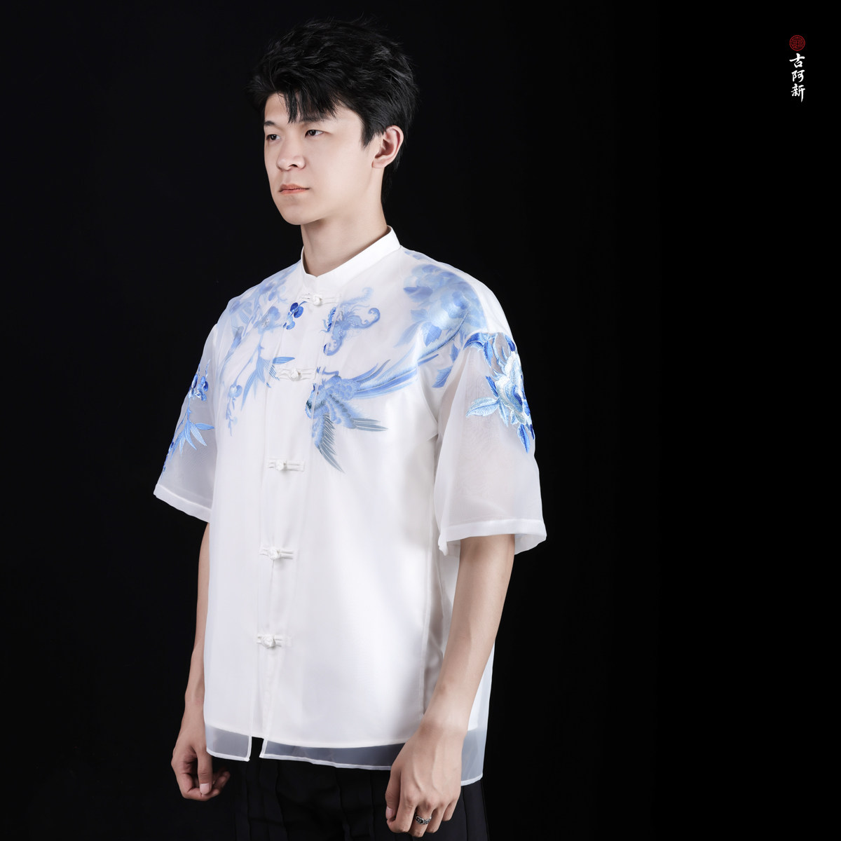淘宝【古阿新国潮】原创中国风锦堂彩刺绣手工盘扣中式轻纱立领短衬衣