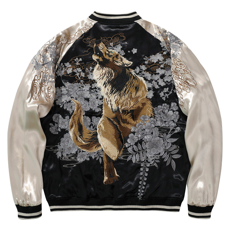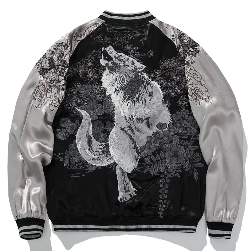国潮重工刺绣横须贺狼图腾男生棒球服夹克缎面丝光外套双面穿春秋