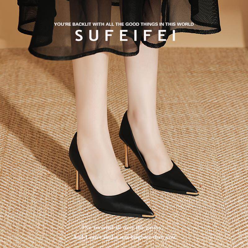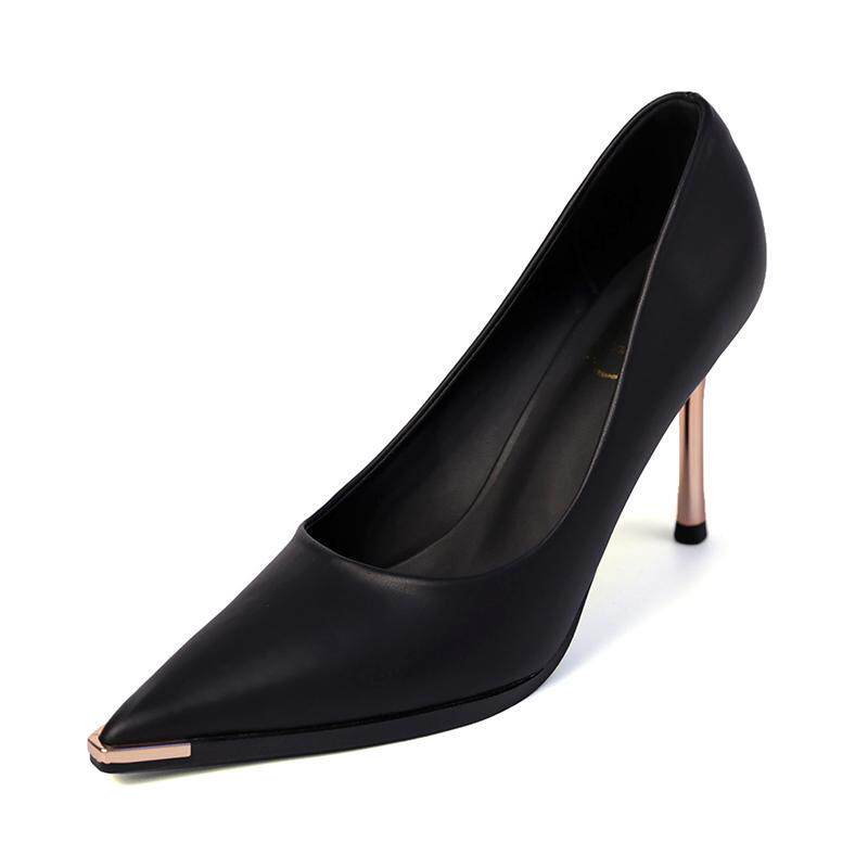 牛皮版~苏妃妃金属鞋头防踢尖头通勤气质黑色高跟鞋女细跟职业鞋