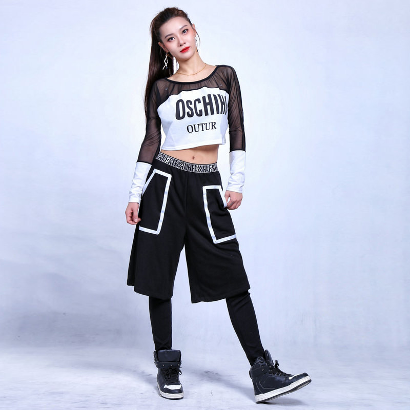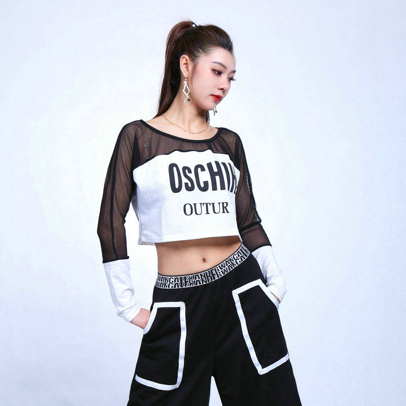 欧美拼接网短款t恤露脐上衣女长袖爵士跳舞jazz设计感蹦迪辣妹装