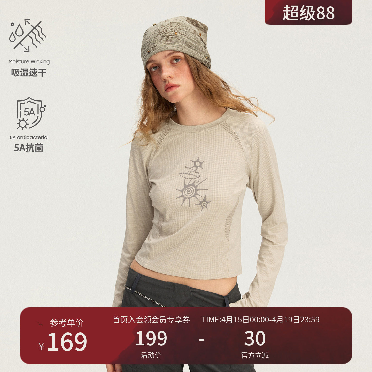 --------------------- 瞬时山野Monterest华夫格肌理拼接5A抗菌吸湿速干印花长袖T恤女 【原售价】219元 【现售价】169元 【推荐理由】