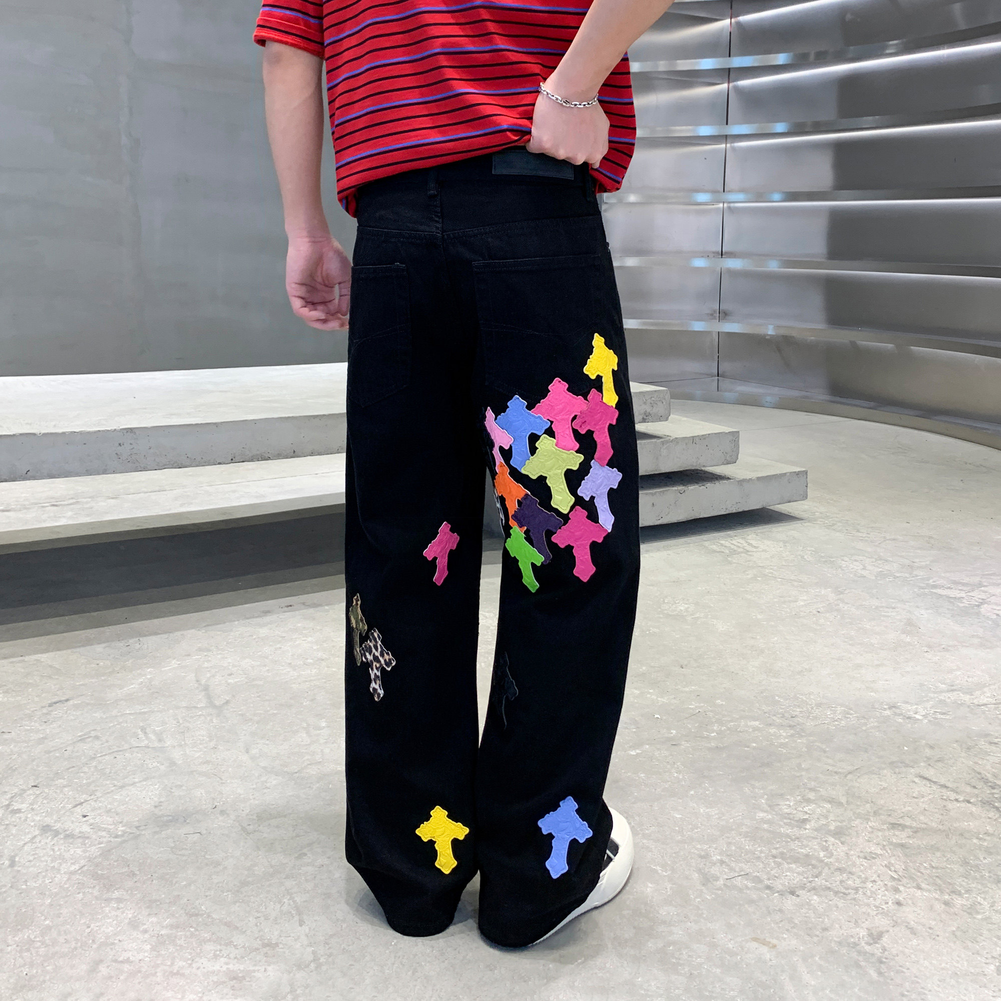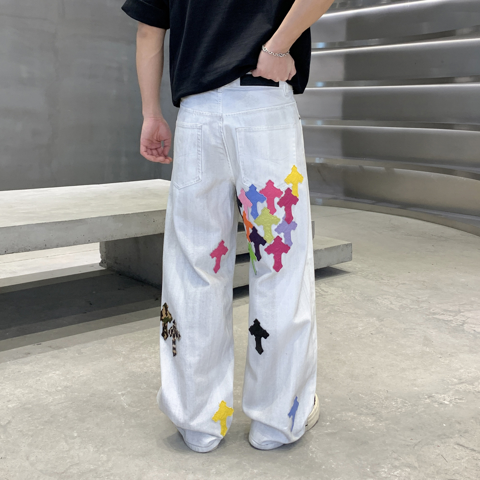 2026春夏季新款慵懒加长彩色拼皮十字架长裤直筒宽松阔腿牛仔裤男