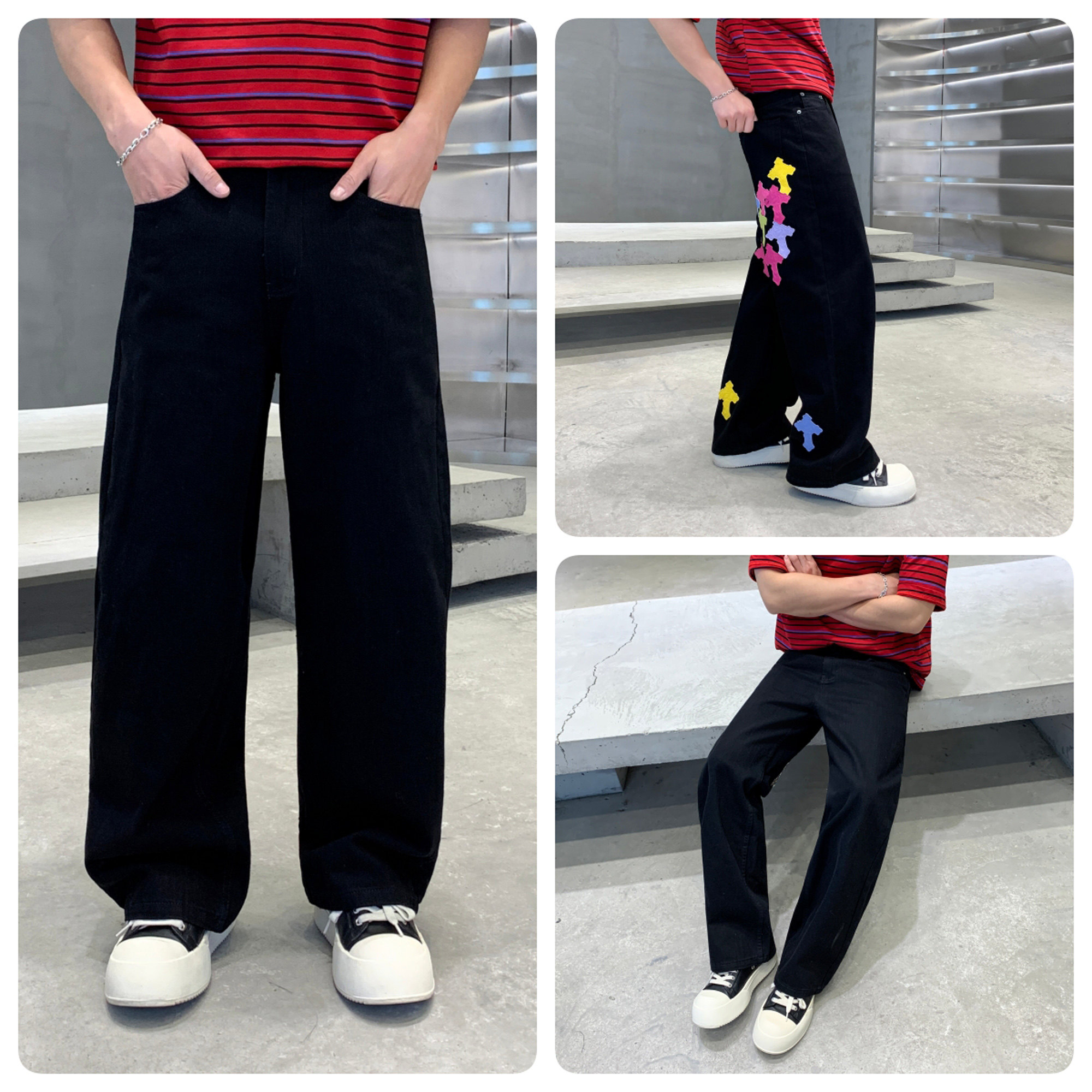 --------------------- 2026春夏季新款慵懒加长彩色拼皮十字架长裤直筒宽松阔腿牛仔裤男 【原售价】155元 【现售价】155元 【推荐理由】