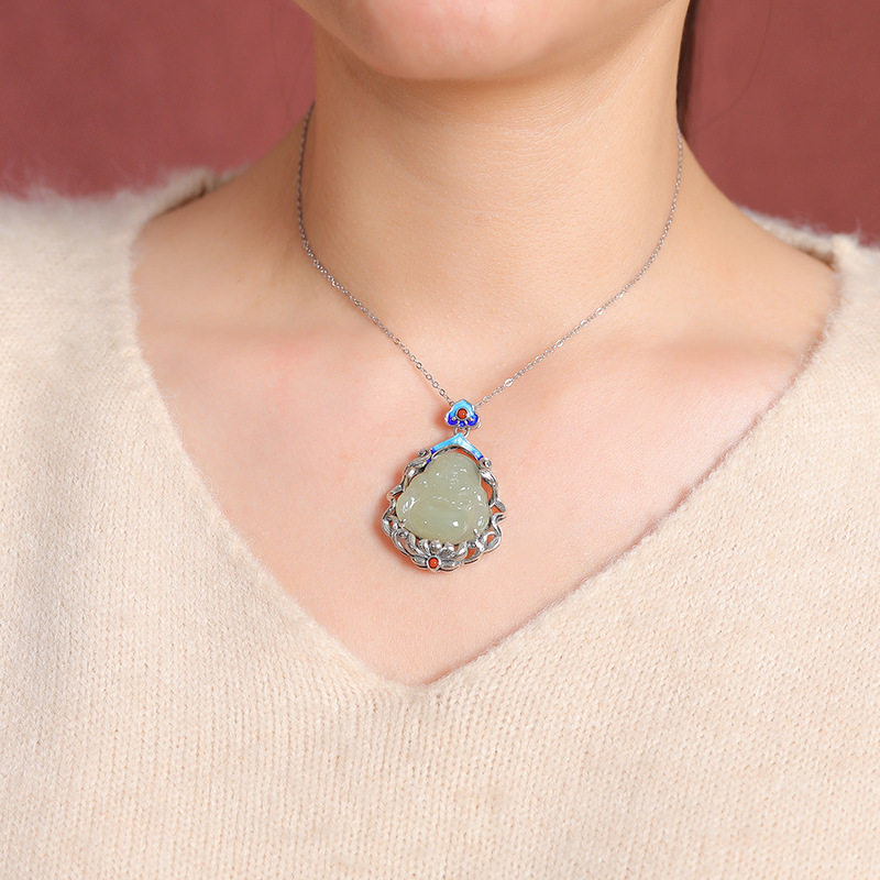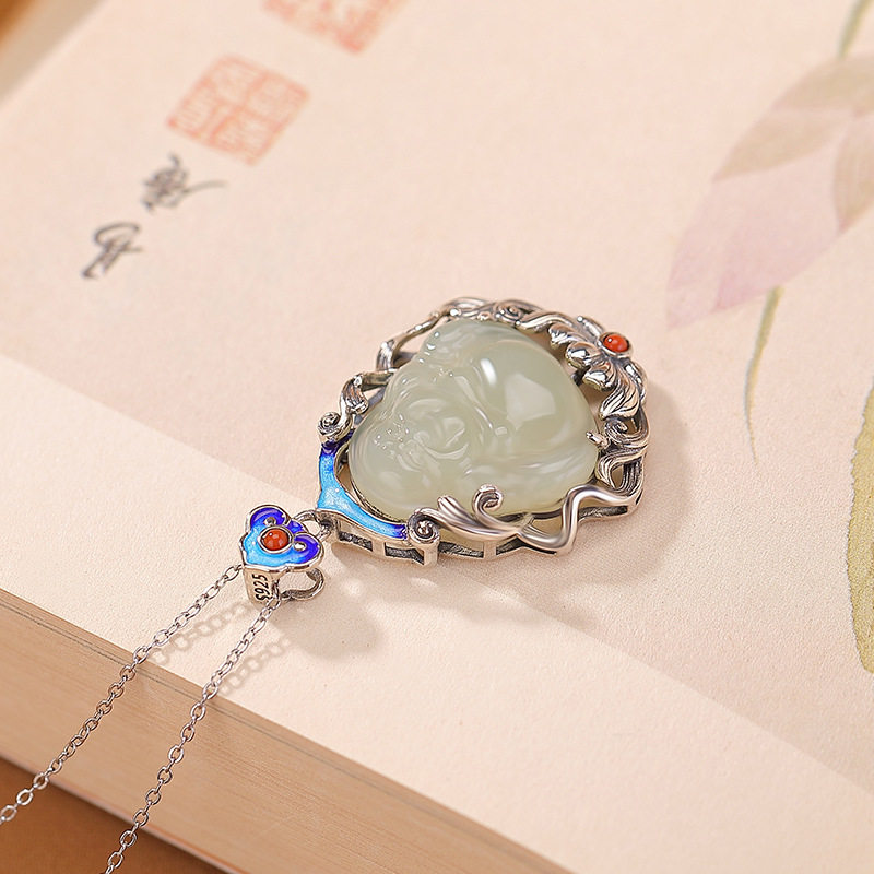 S925纯银和田玉南红玛瑙复古做旧莲花弥勒佛烧蓝银吊坠挂坠