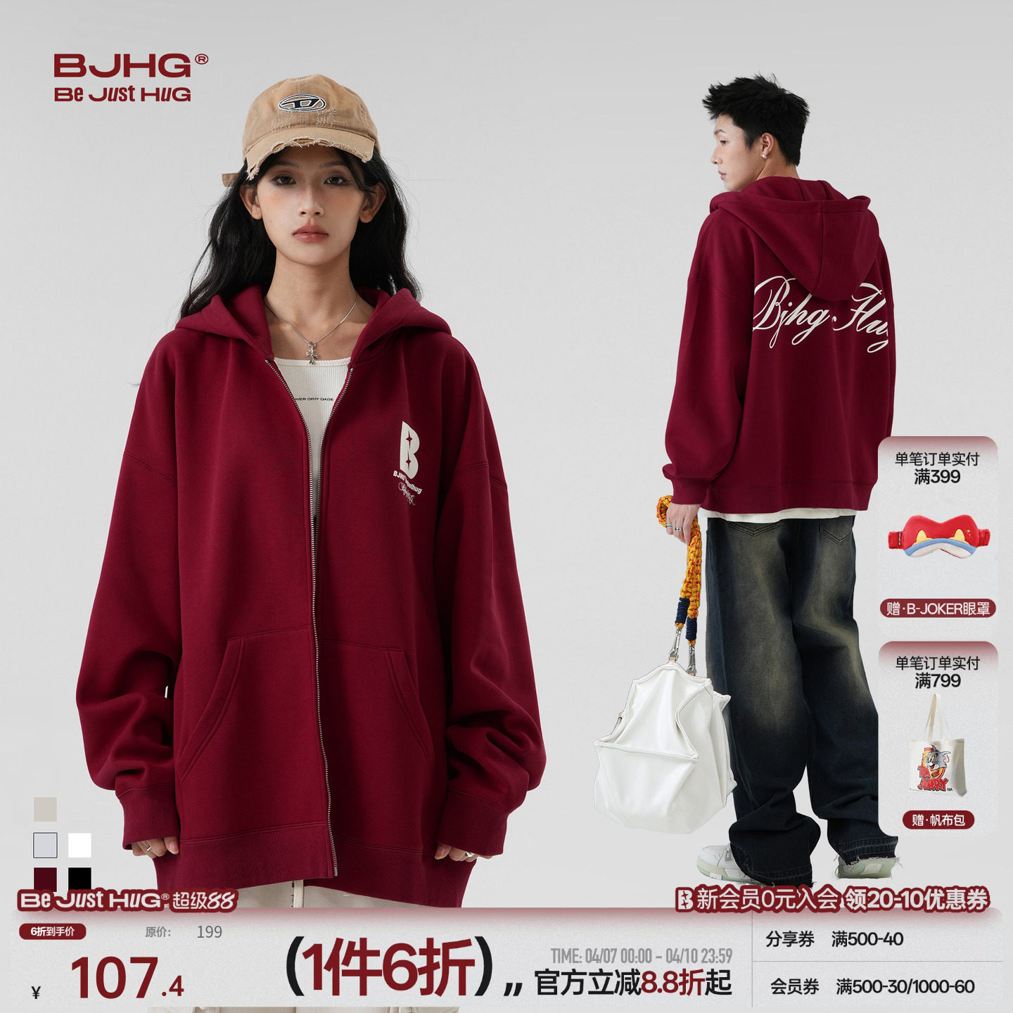 --------------------- BJHG不计后果重磅连帽酒红色卫衣外套男款秋季美式运动夹克外套女 【原售价】299元 【现售价】107元 【推荐理由】