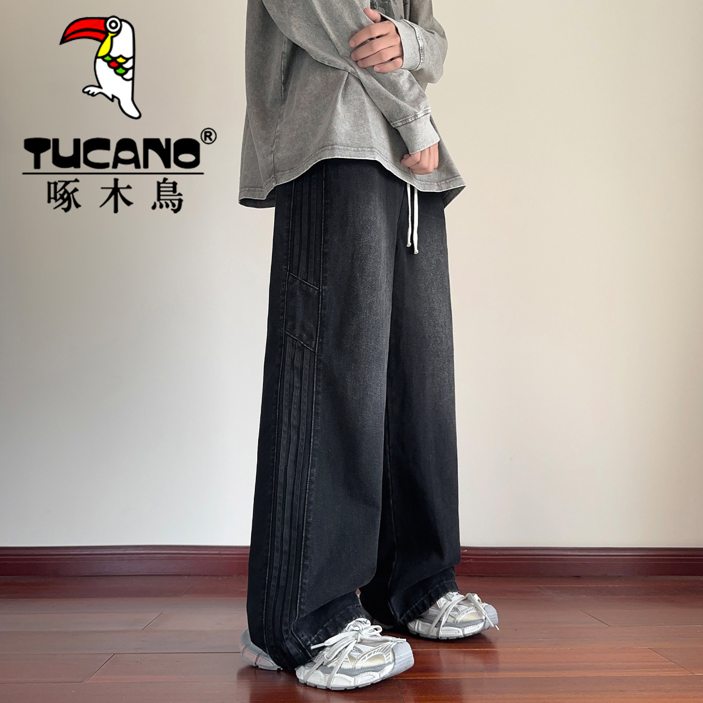 啄木鸟阔腿牛仔裤男春秋季条纹美式风复古宽松直筒学生休闲长裤子