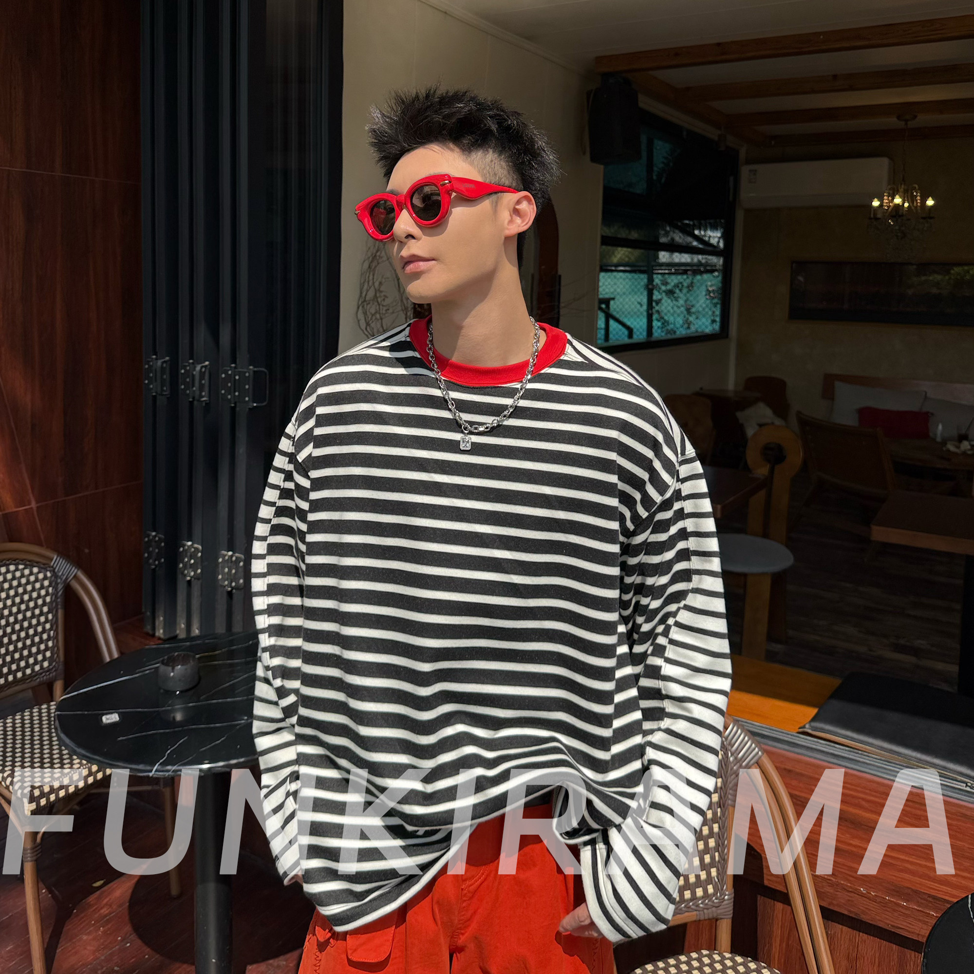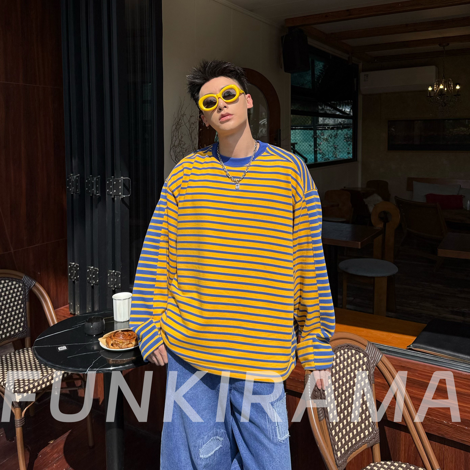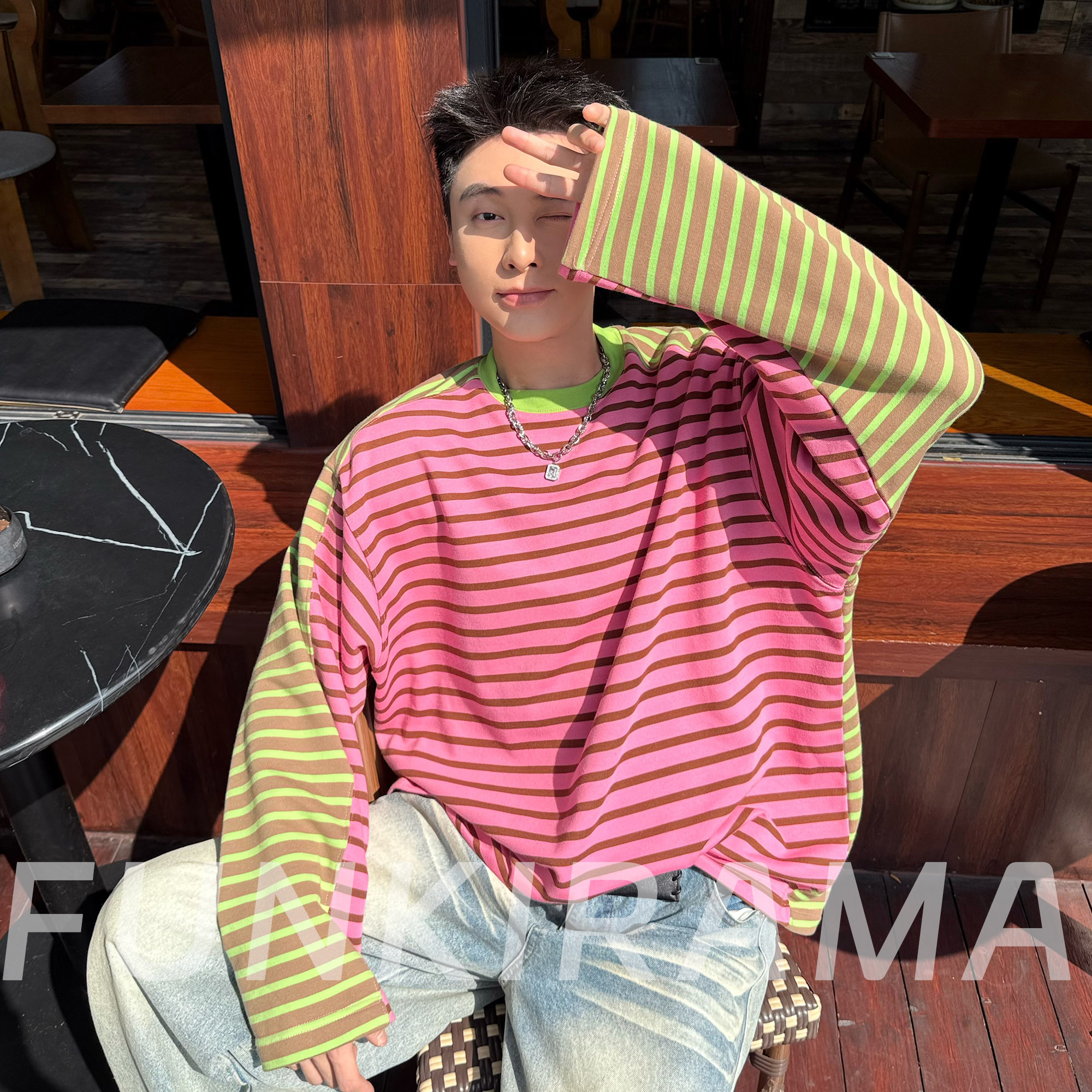 2026春季新款撞色T恤原创设计美式休闲拼接条纹撞色毛圈棉男长袖