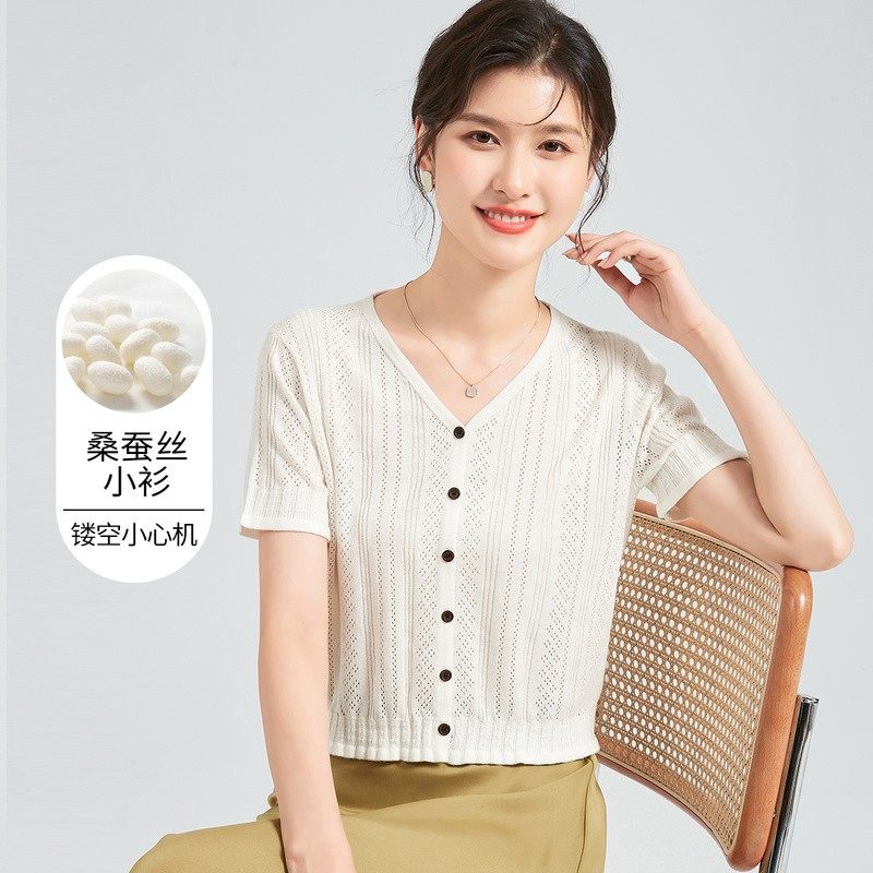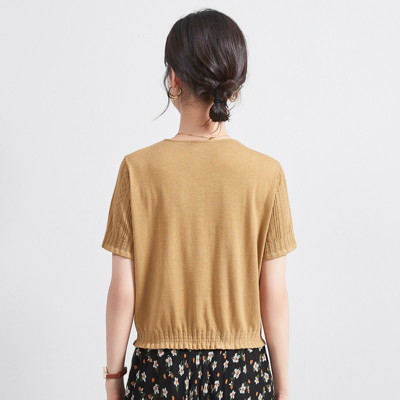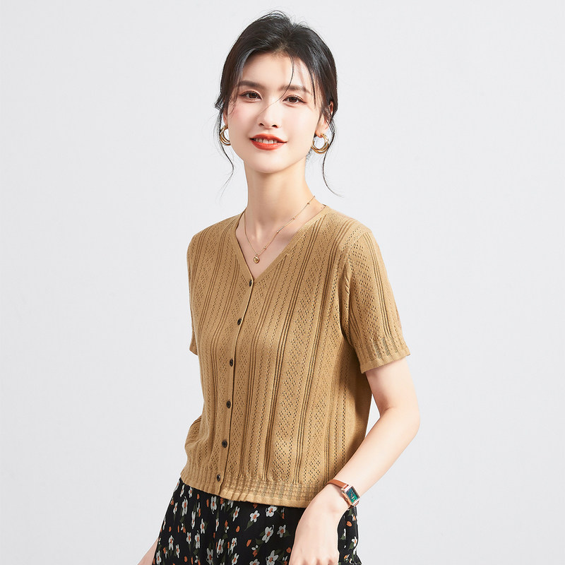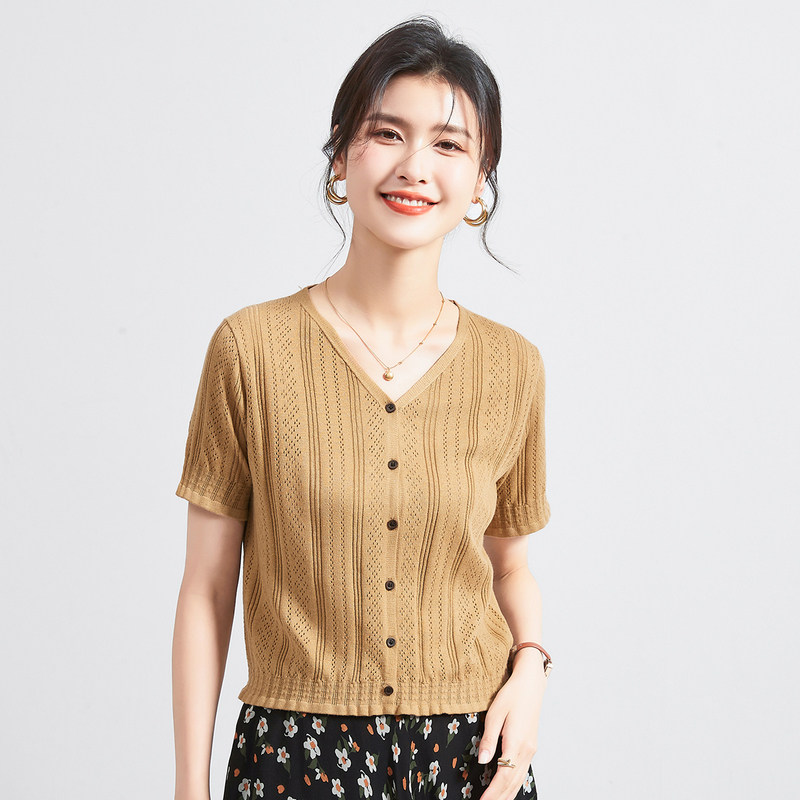 淘宝【李夫人粉丝专享】夏季V领短袖镂空纯色开衫百搭女式针织衫