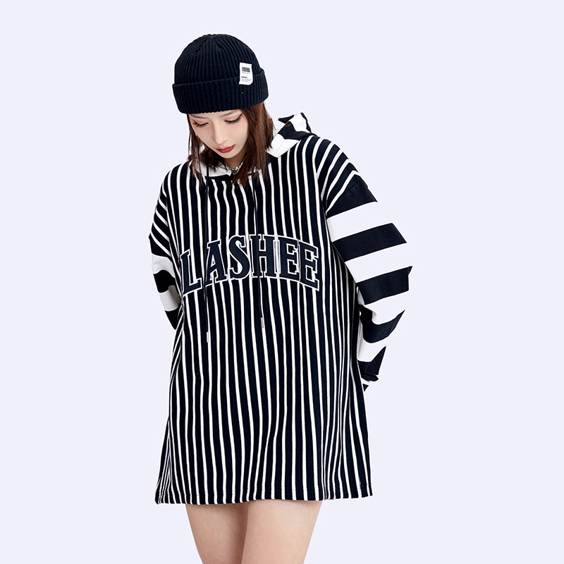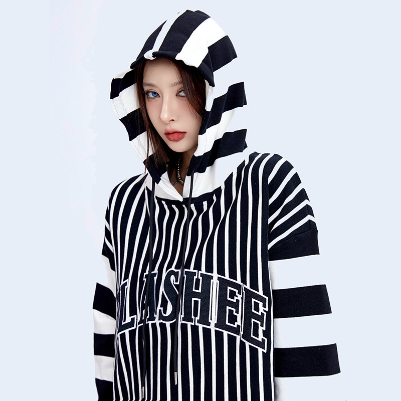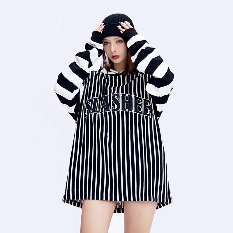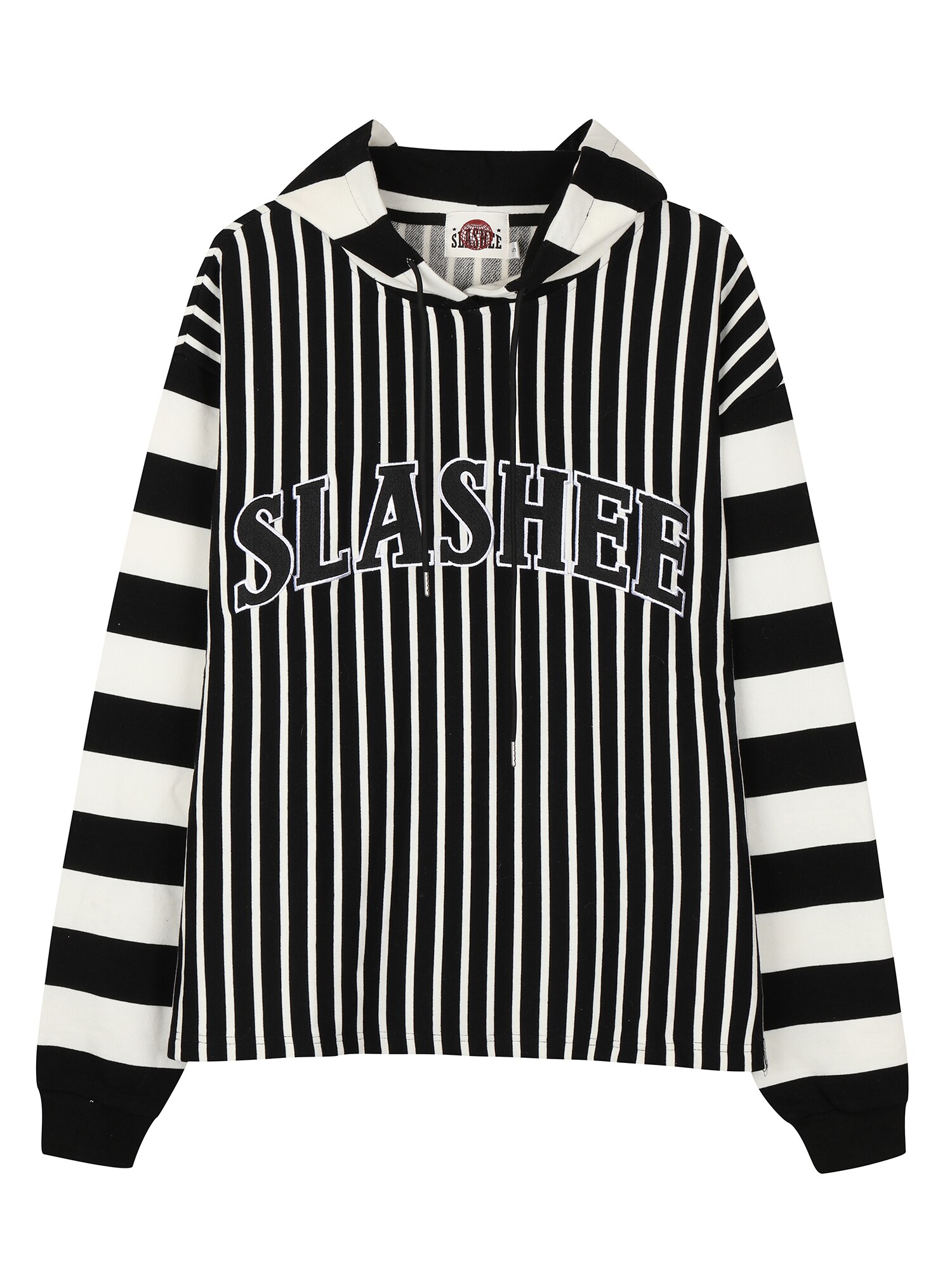 SLASHEE / 400g毛圈粗细条纹拼接刺绣连帽卫衣