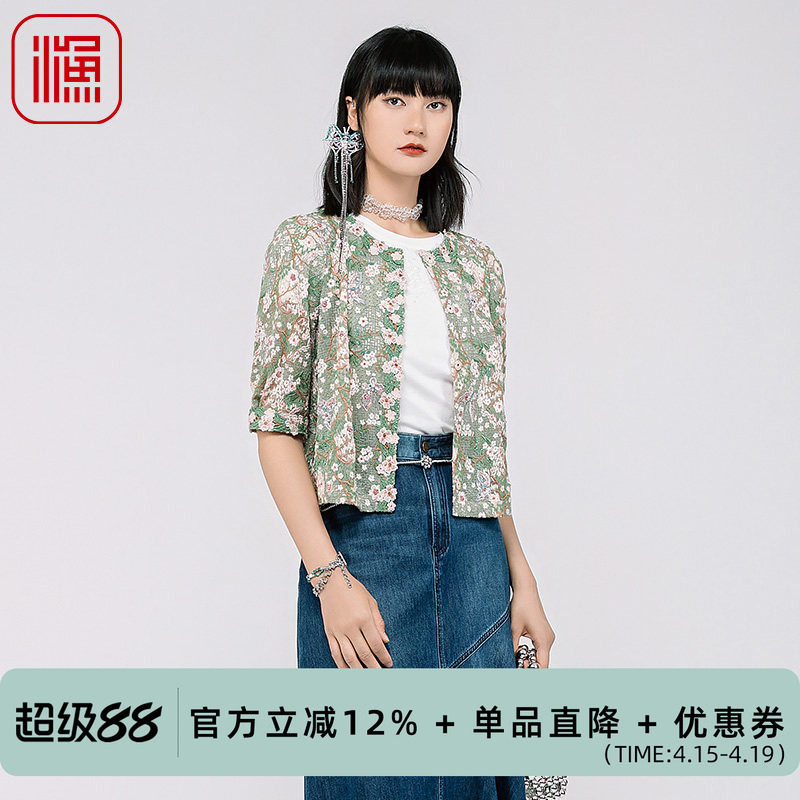 渔服饰国风女装2024新款网布满身绣花圆领中袖短款外套女FGGB3052