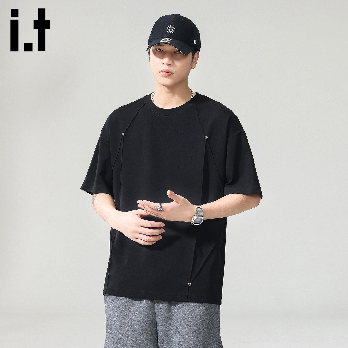 it:fivecm美式短袖男夏季新款宽松休闲半袖上衣立体压褶铆钉t恤