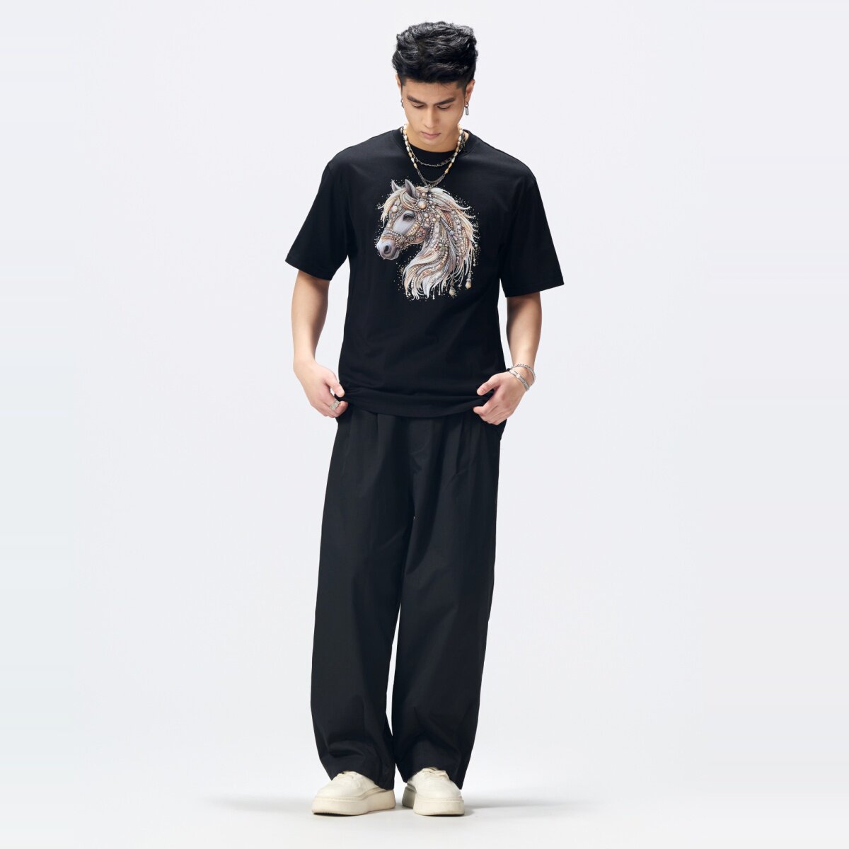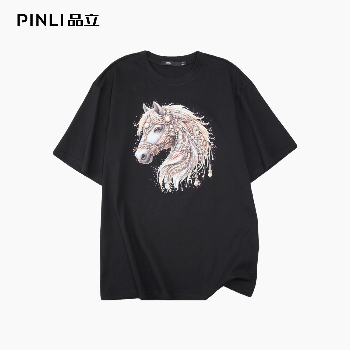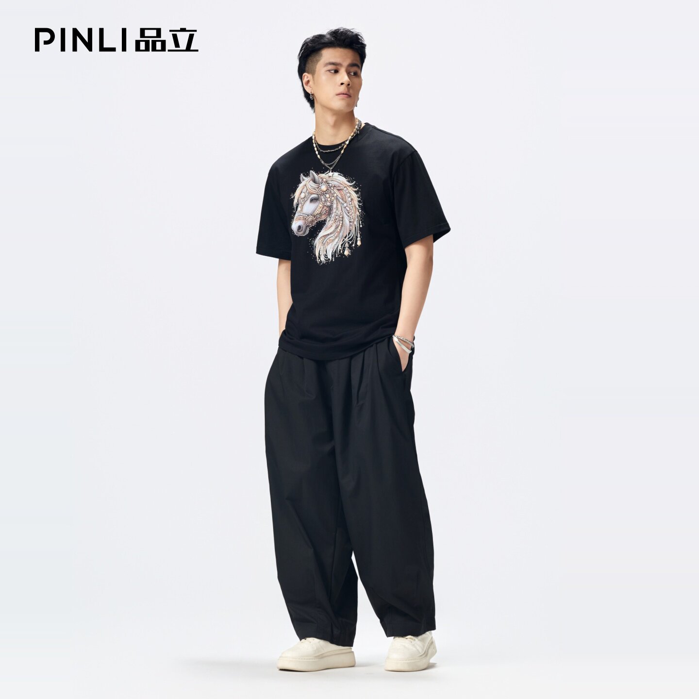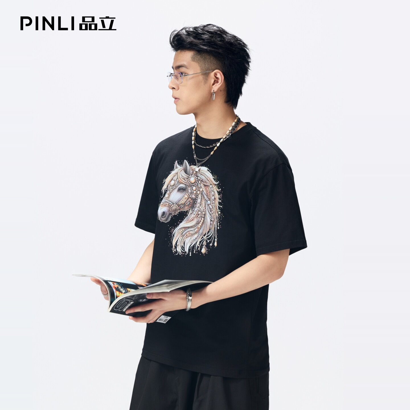 --------------------- PINLI品立2026夏季新款男士马年烫画烫钻圆领落肩短袖T恤上衣潮牌 【原售价】129元 【现售价】95元 【推荐理由】