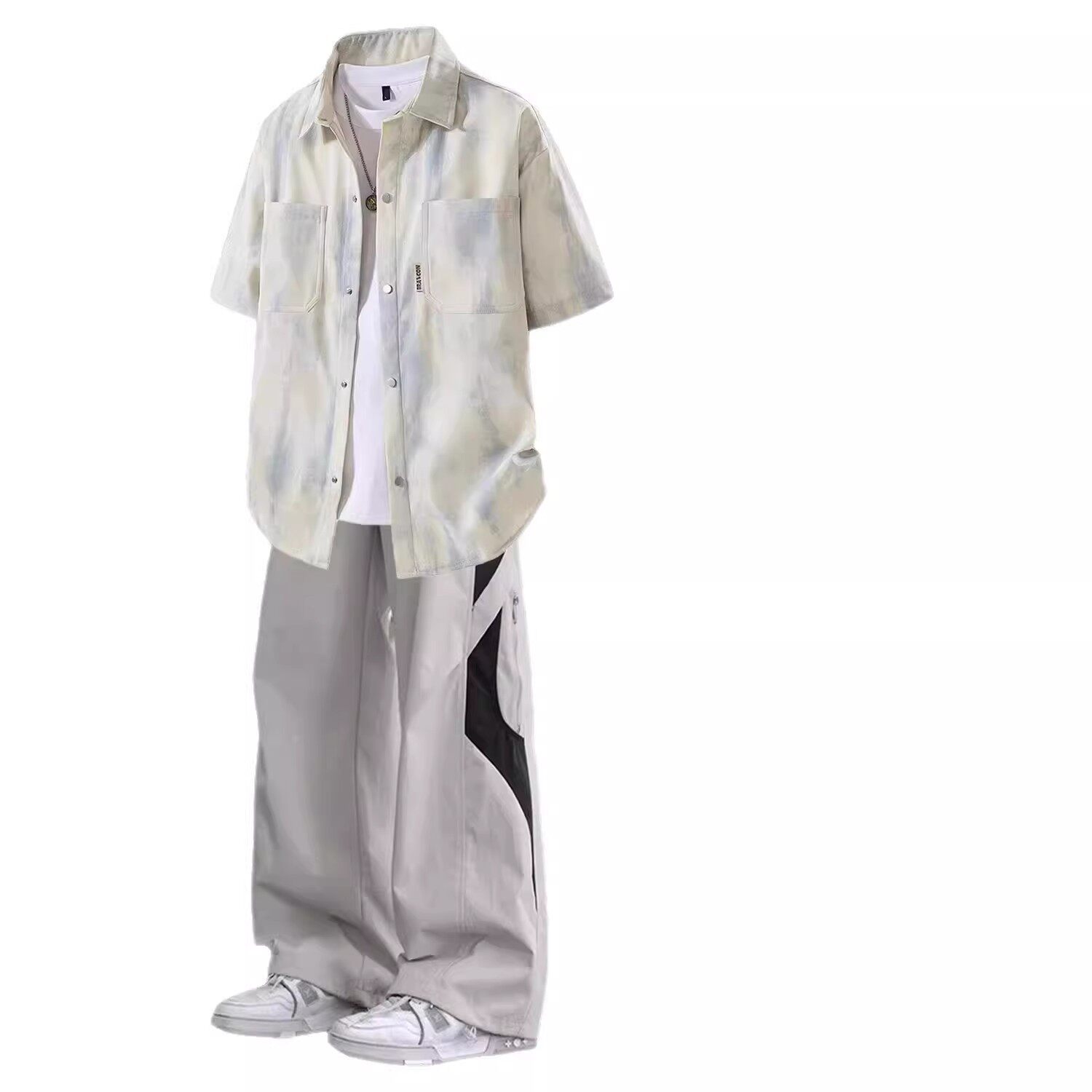 BENTIDEA 扎染短袖衬衫男学生休闲套t装2025新款夏季美式潮牌衬衣