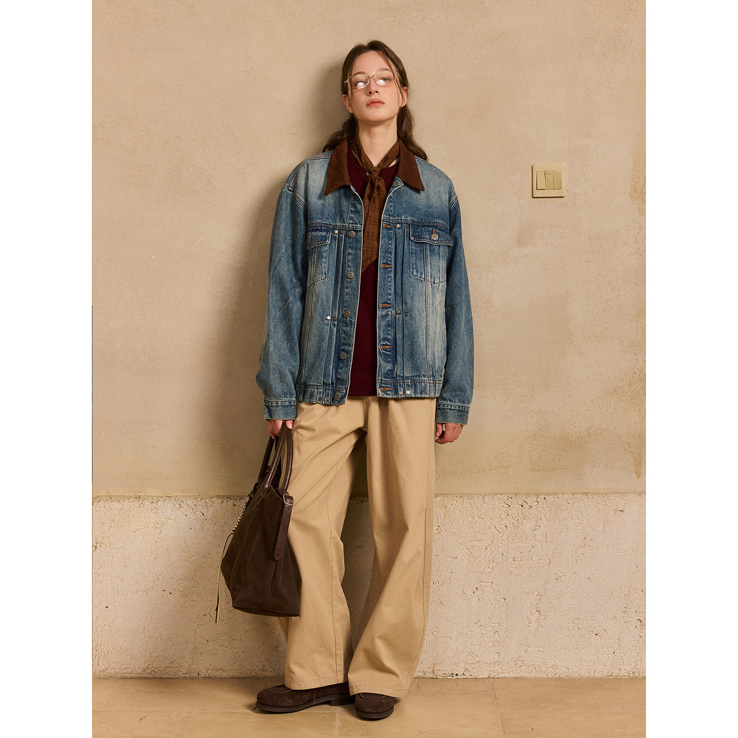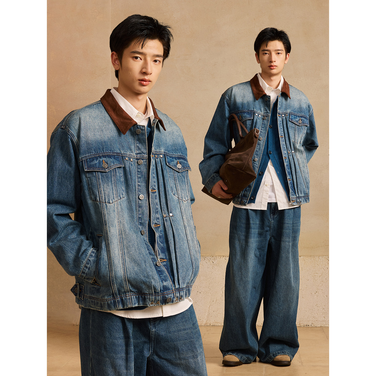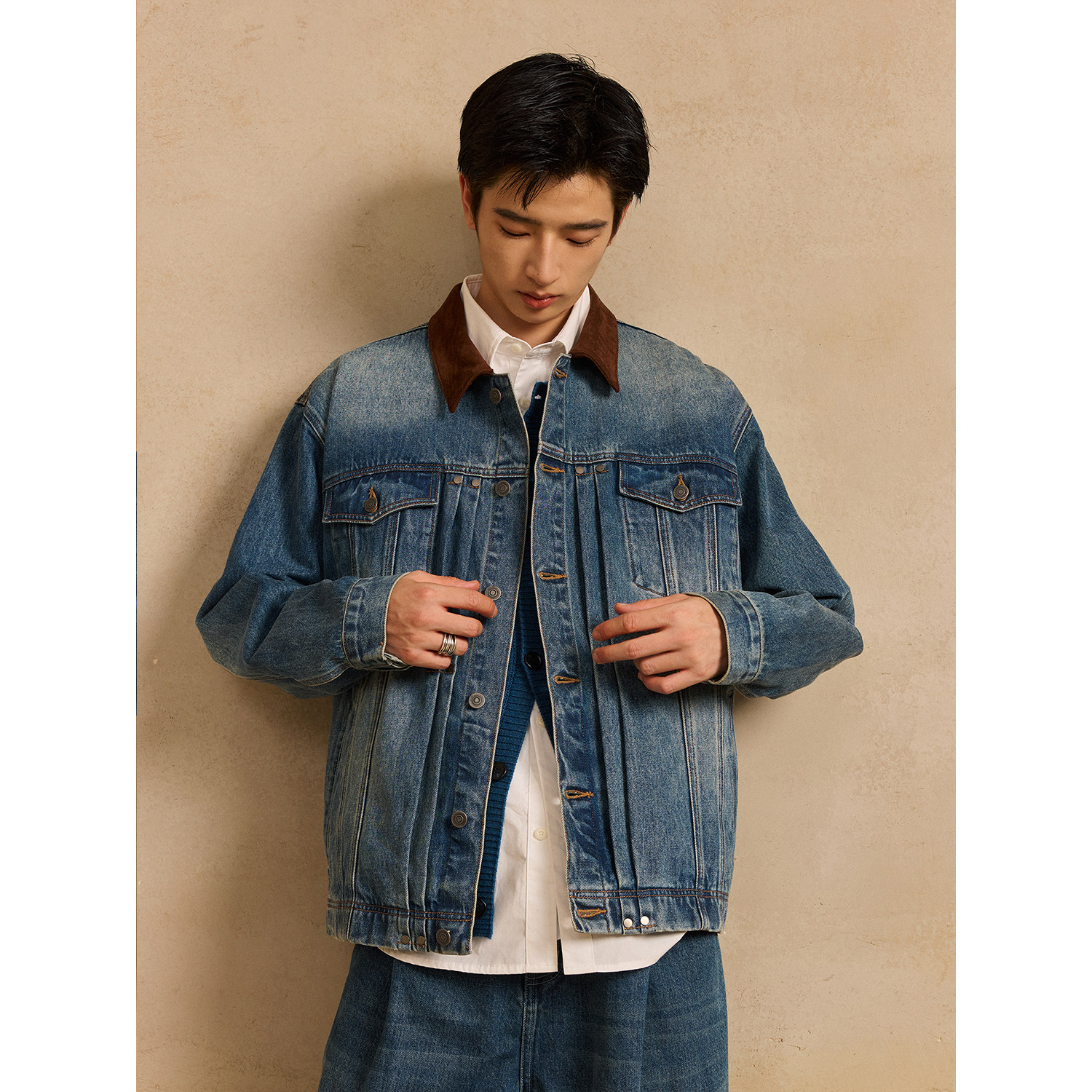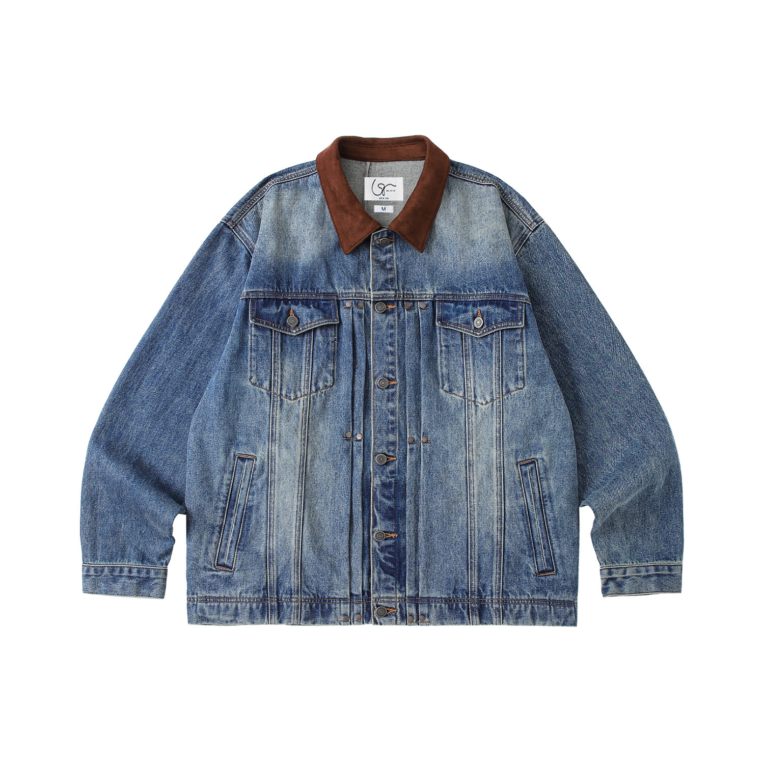 LR MADE 撞色麂皮领 多重水洗做旧 复古双袋牛仔外套夹克