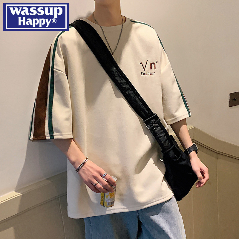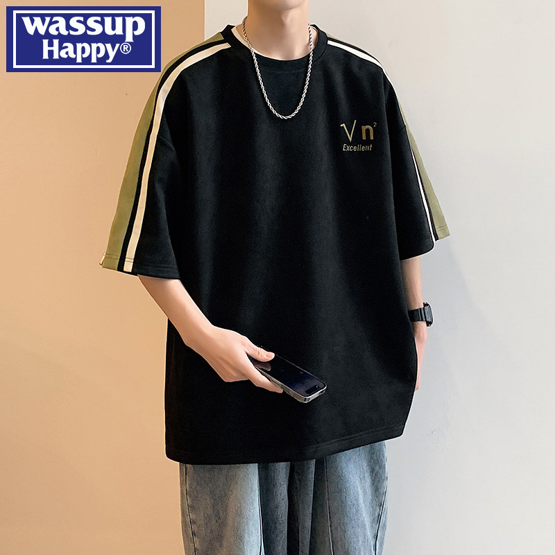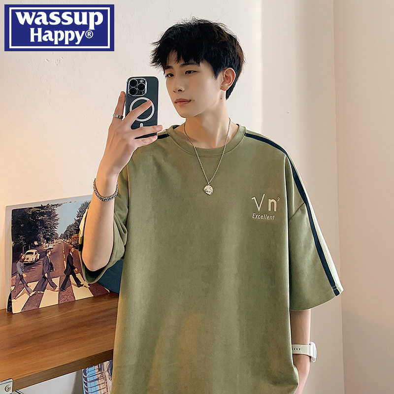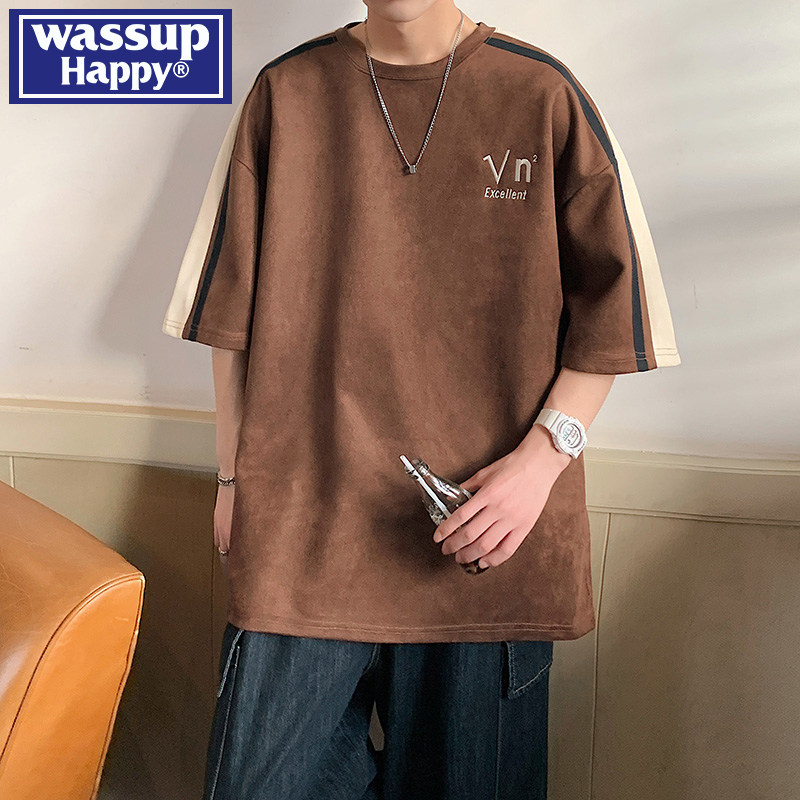 wassup happy麂皮绒短袖t恤男夏季拼接条纹上衣潮流休闲圆领体恤