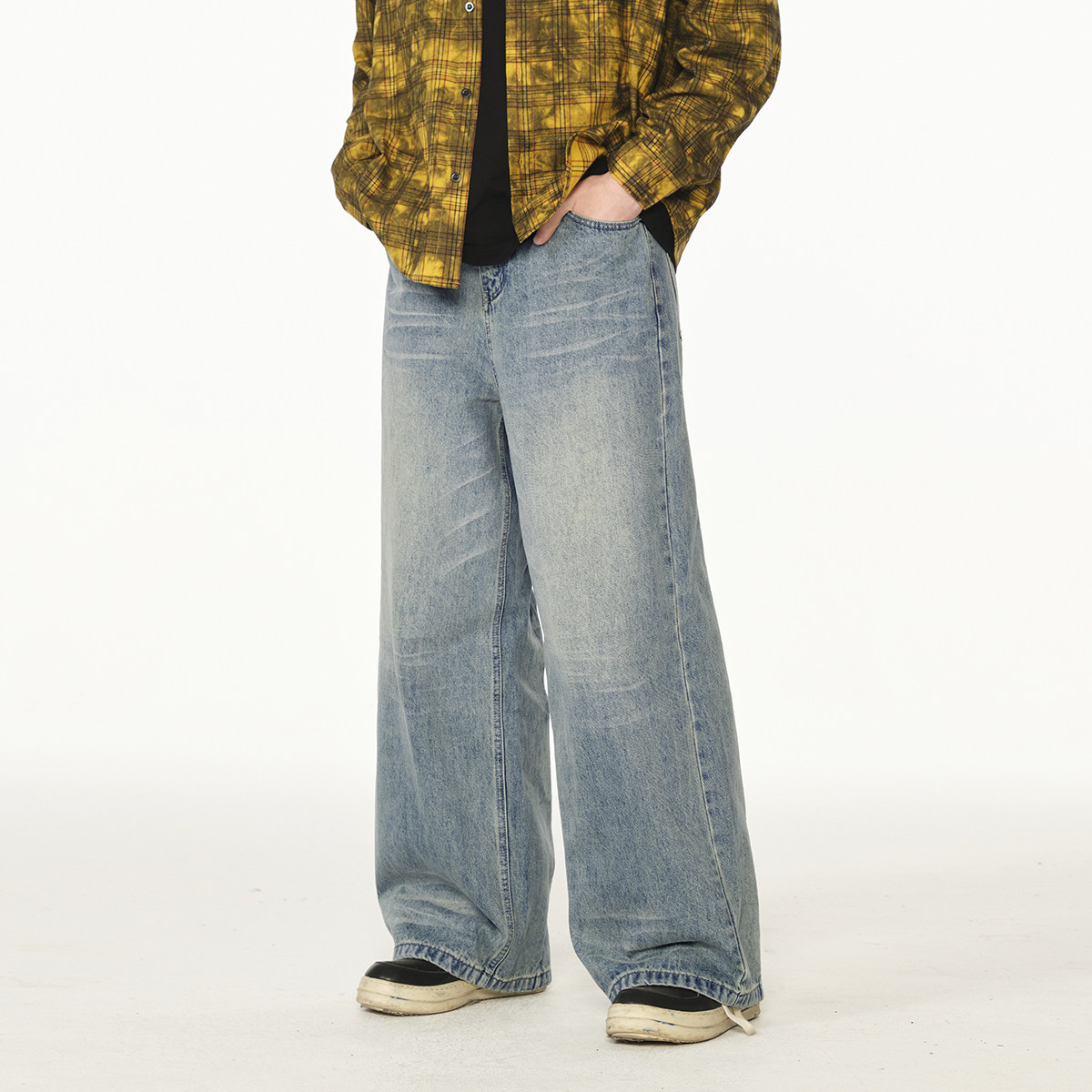 FORNINES水洗蓝色阔腿直筒牛仔裤男女宽松美式潮牌cleanfit长裤子