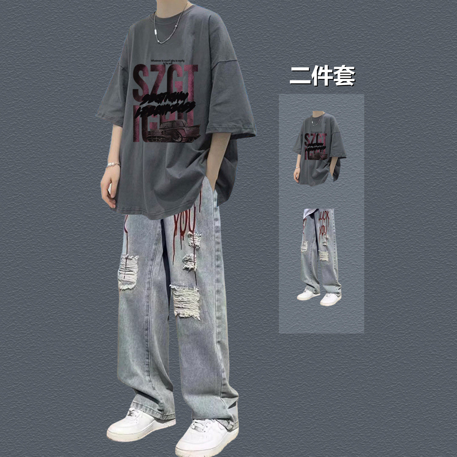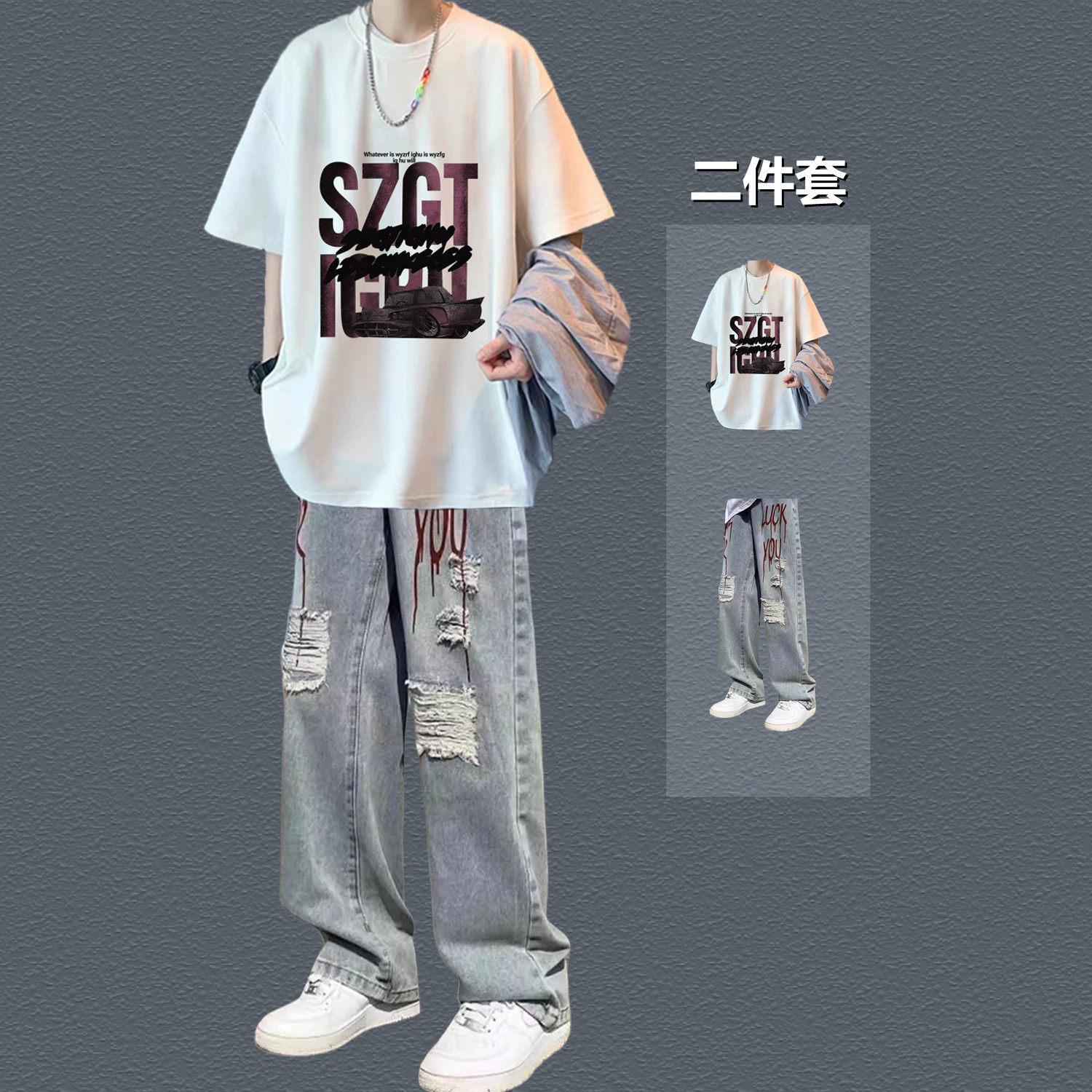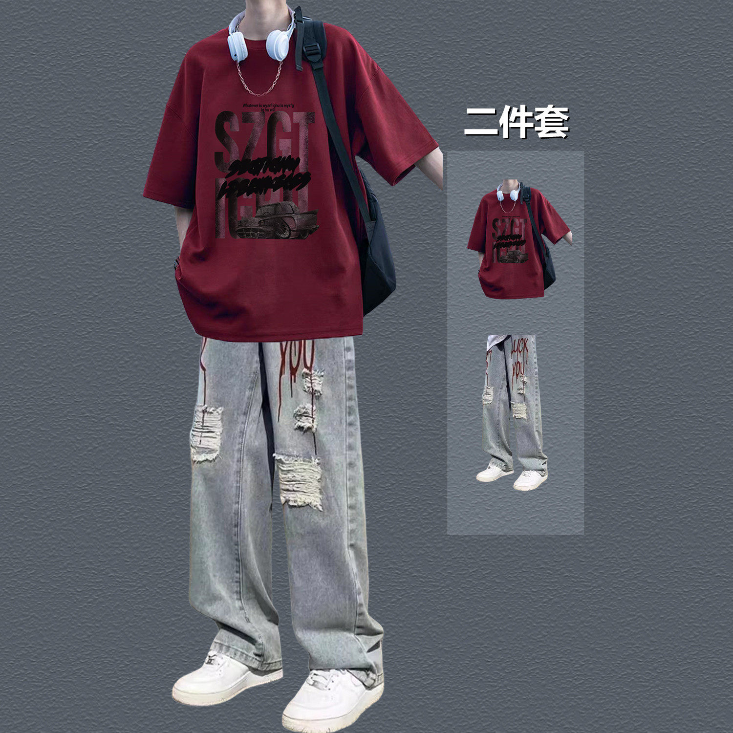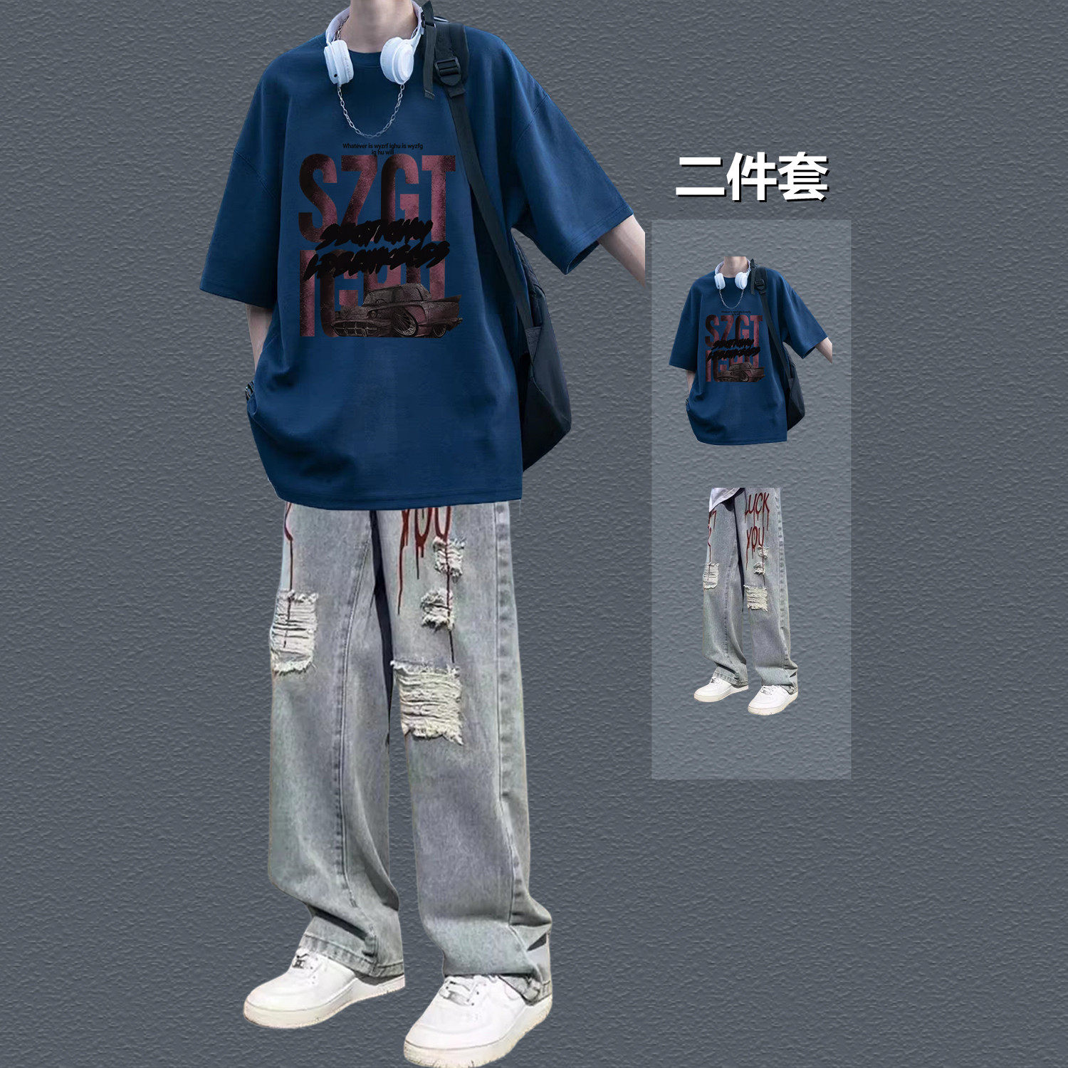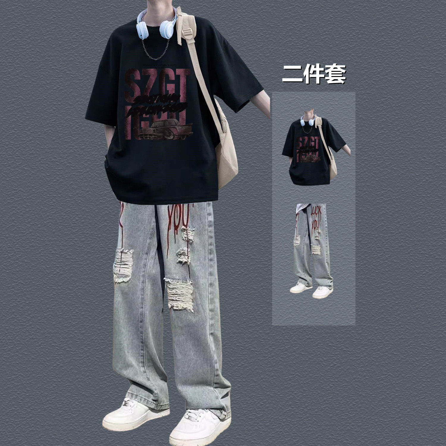 淘宝BENTIDEA 夏季短袖套装男生美式潮流t恤搭配破洞牛仔裤宽松显高穿